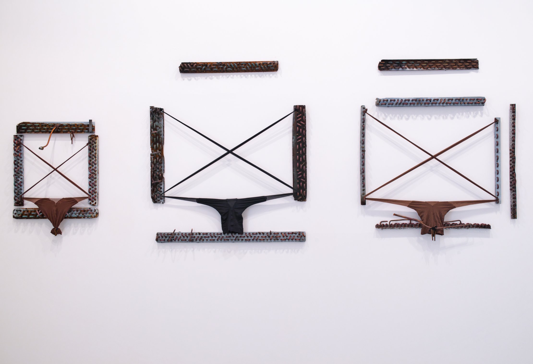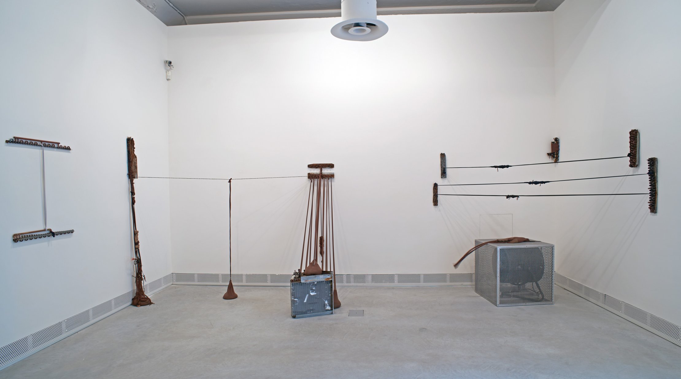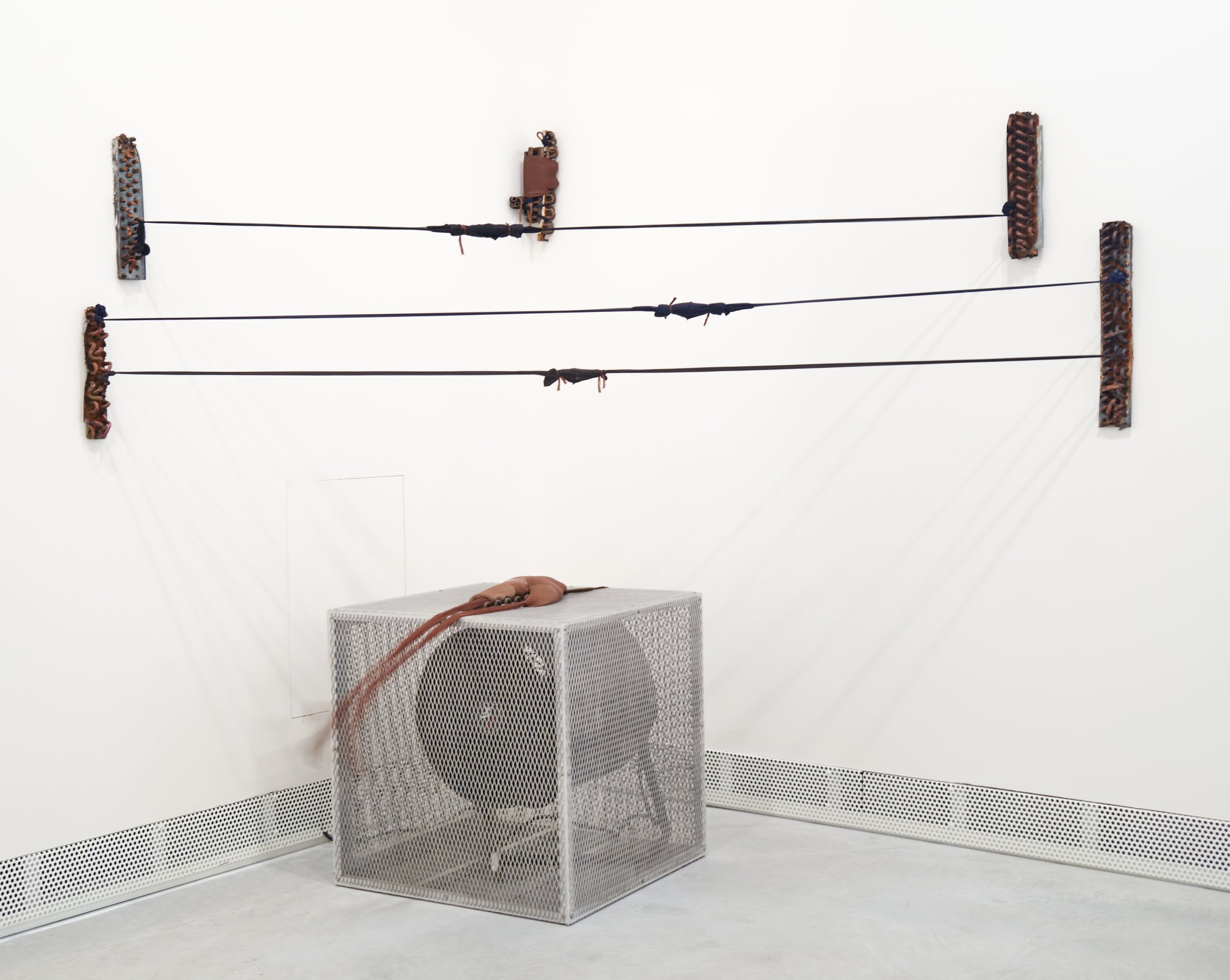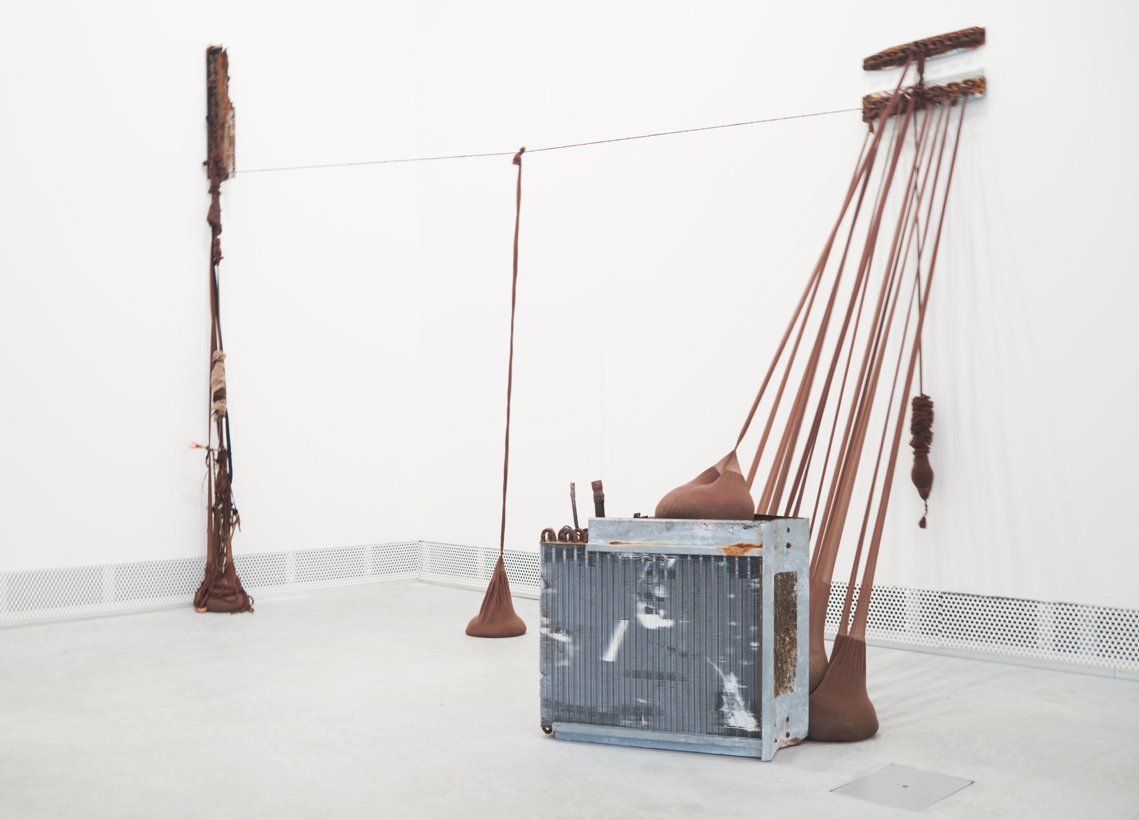 A.C.Q. (II), 2016-17. Refrigerator parts, nylon pantyhose. Left element: 27 × 20 in.