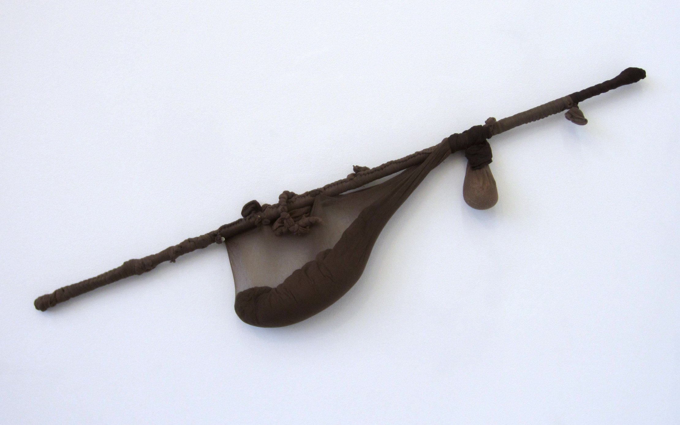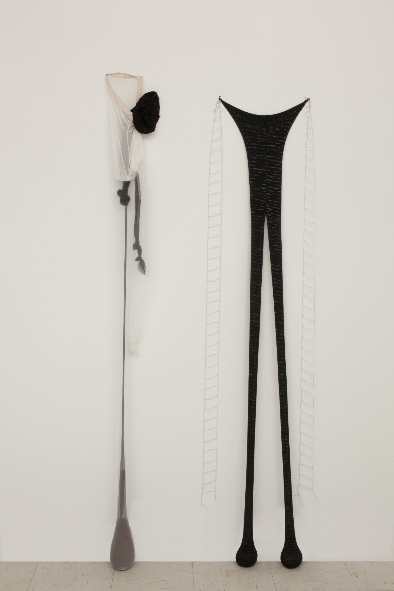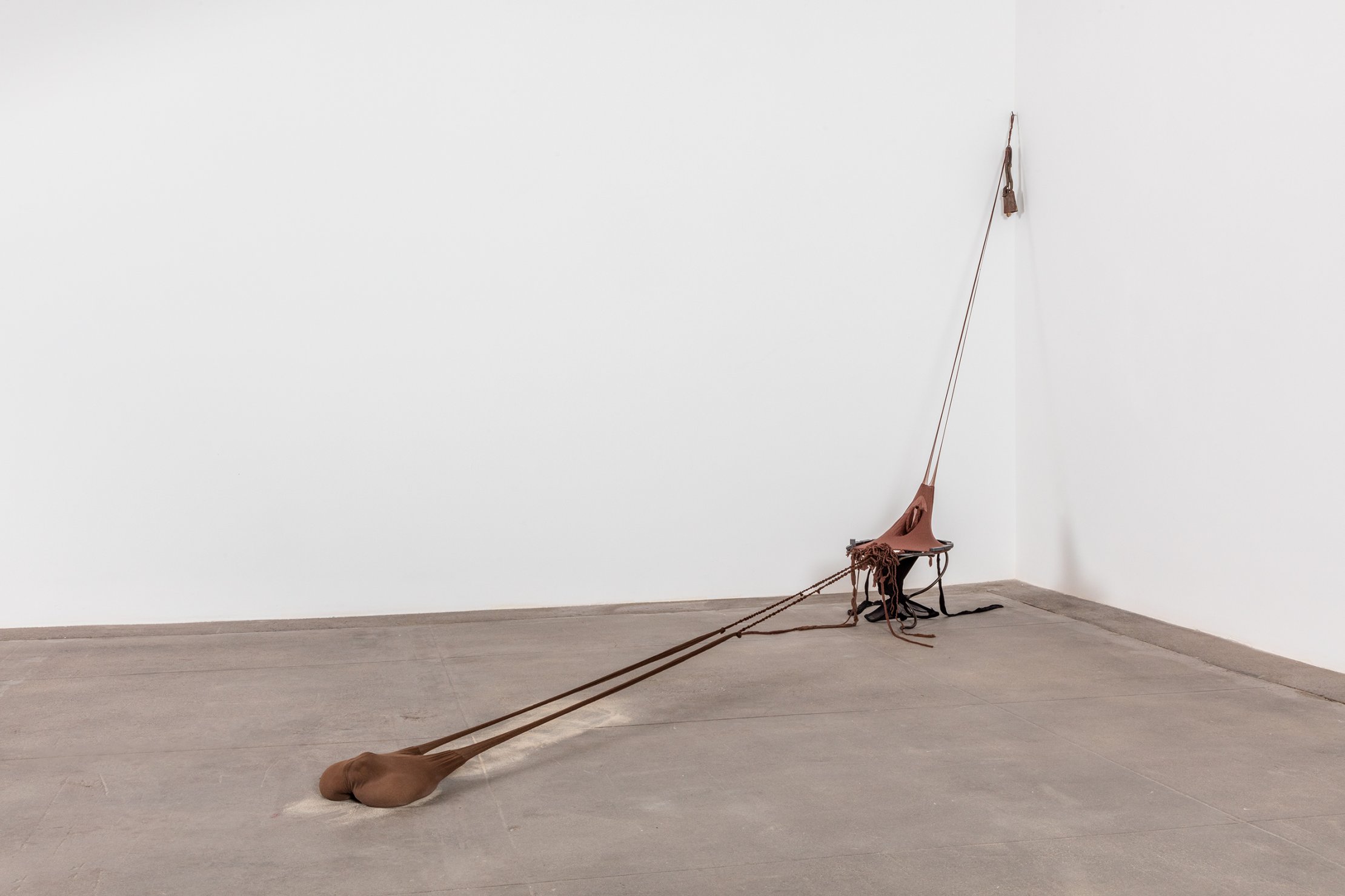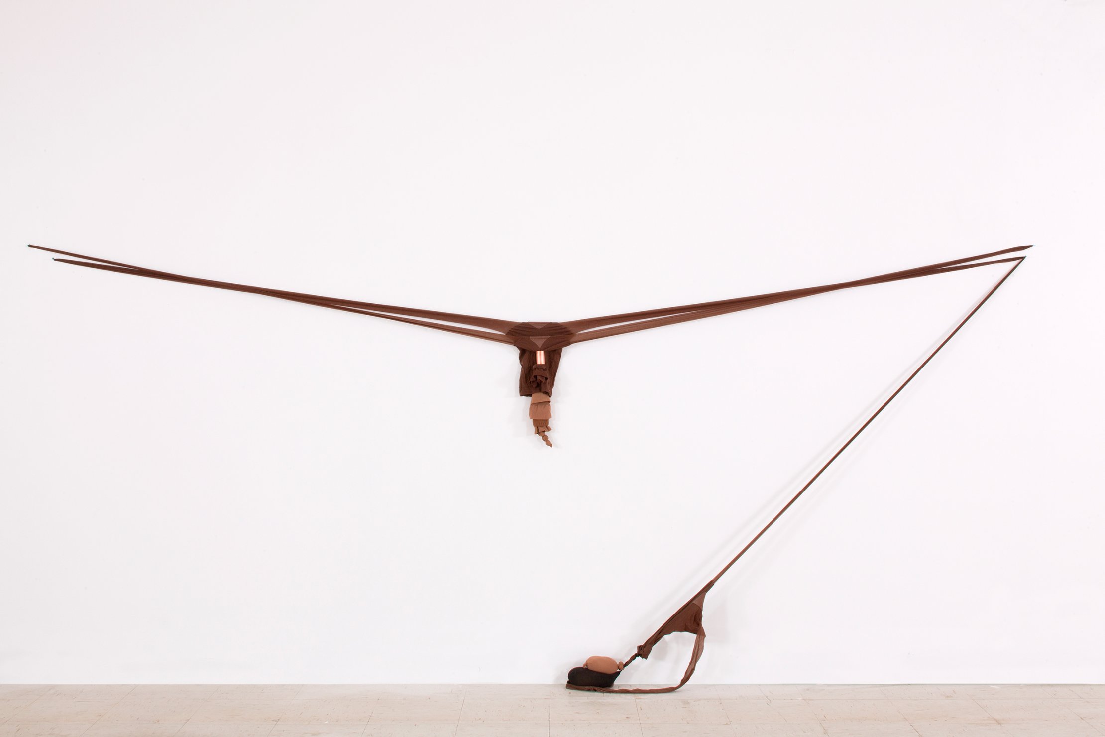 R.S.V.P. Reverie "Bow Leg", 2014. Nylon mesh, found metal and bell, 60 × 8 × 8 in. (collection of The Museum of Fine Arts, Houston, TX).">