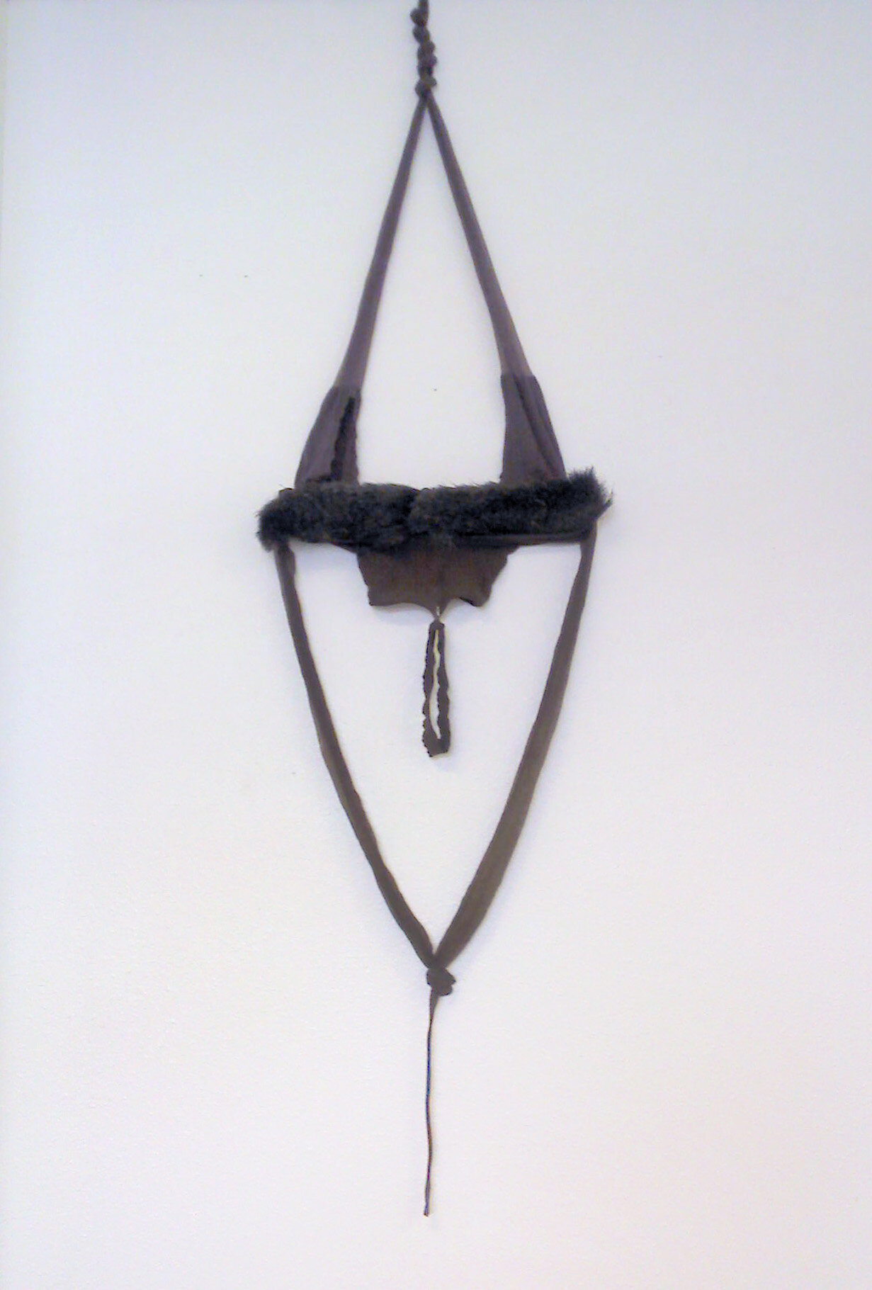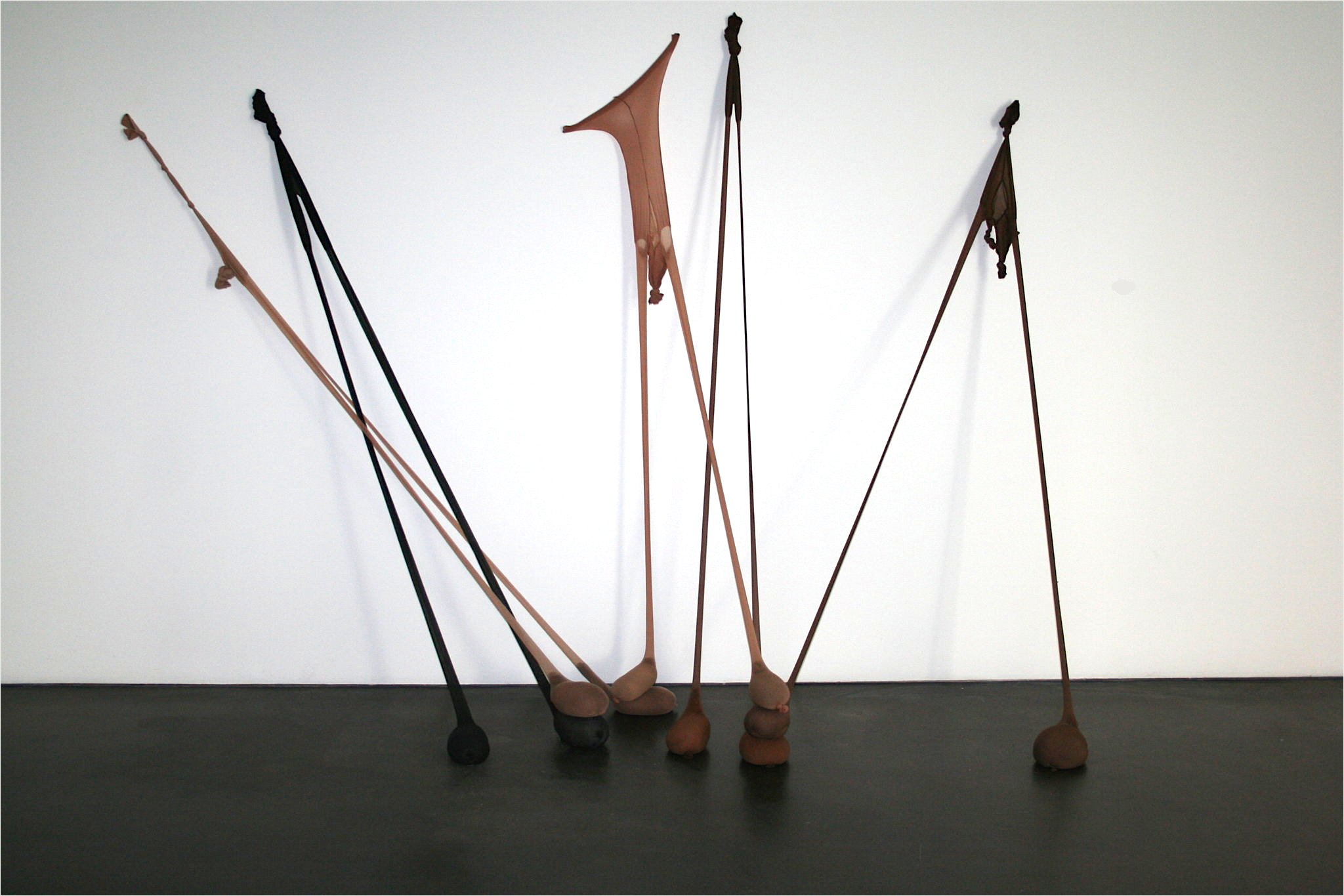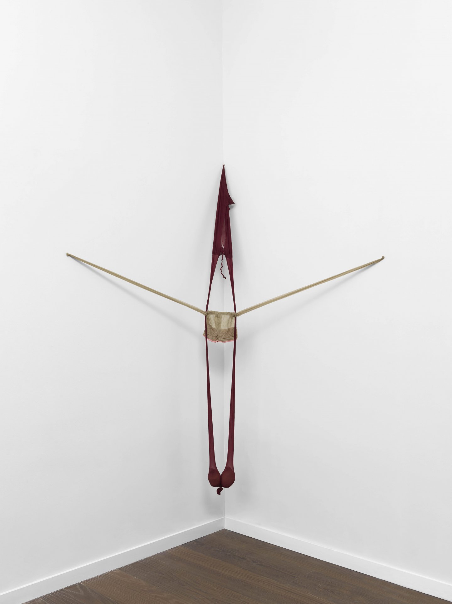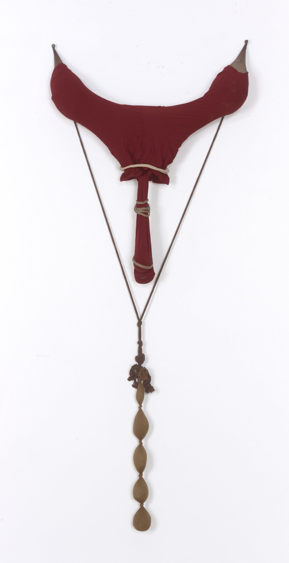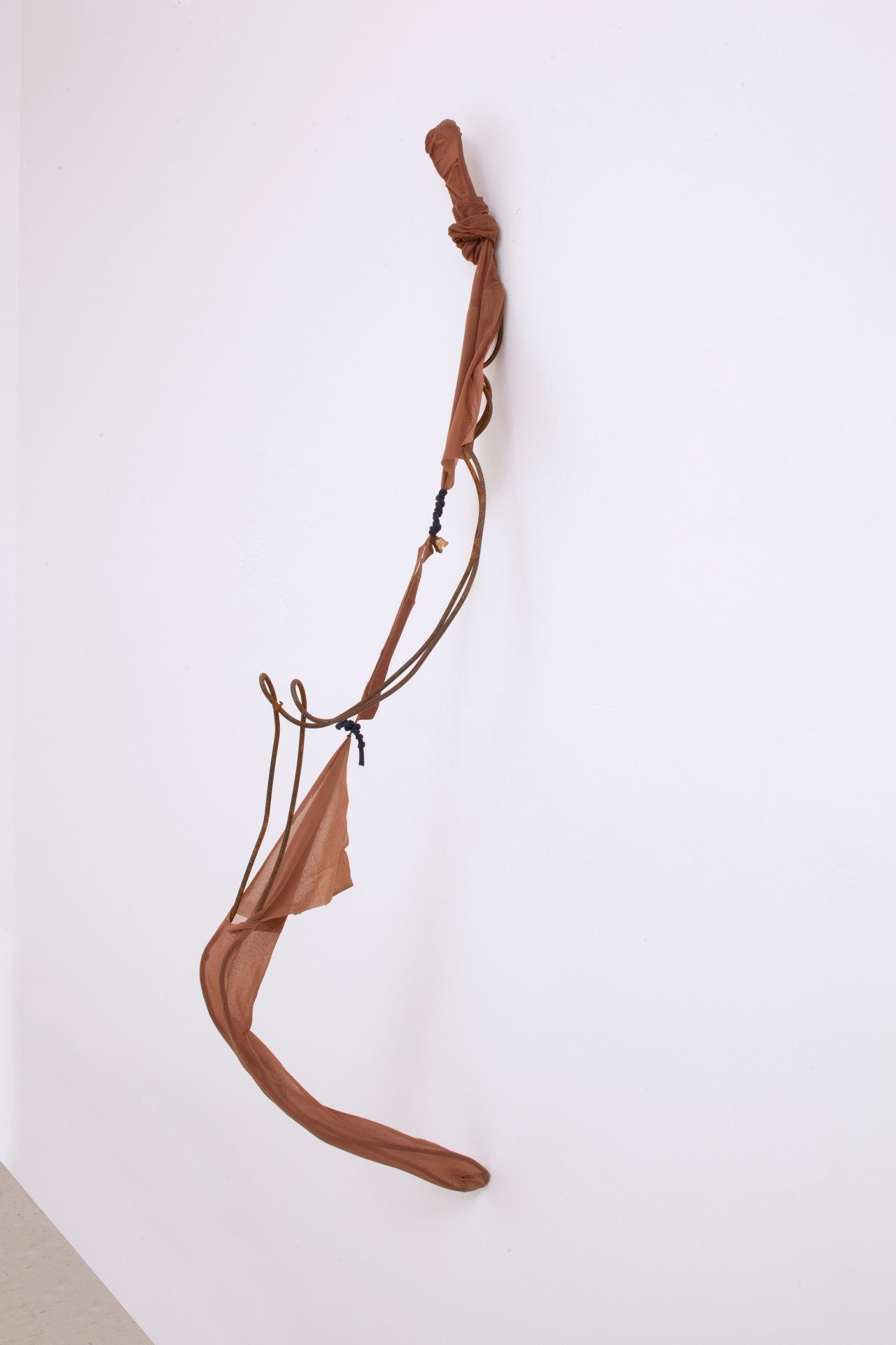 R.S.V.P. Reverie "Bow Leg", 2014. Nylon mesh, found metal and bell, 60 × 8 × 8 in. (collection of The Museum of Fine Arts, Houston, TX).">