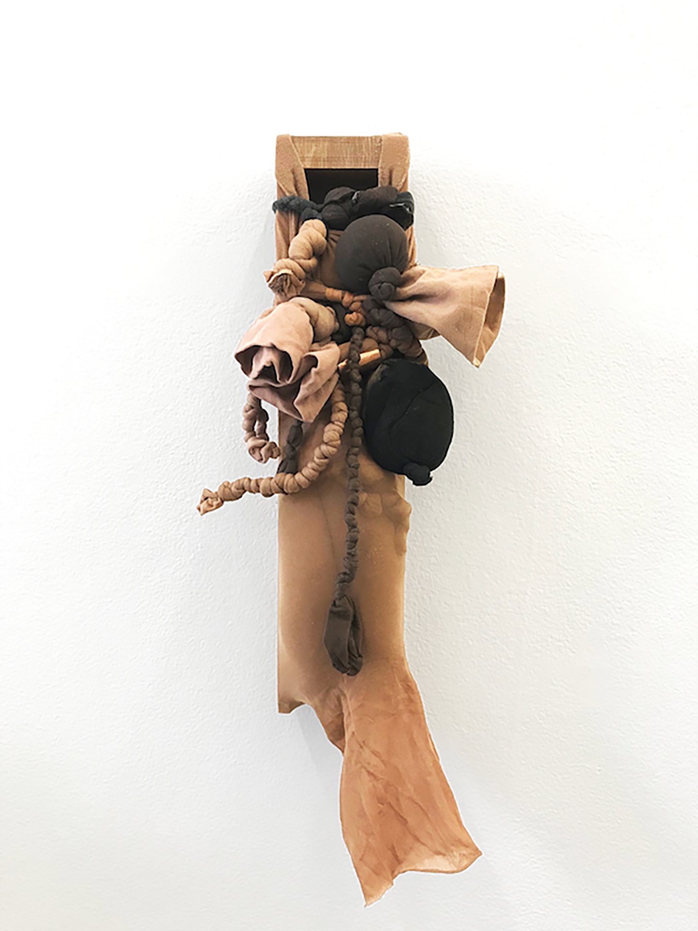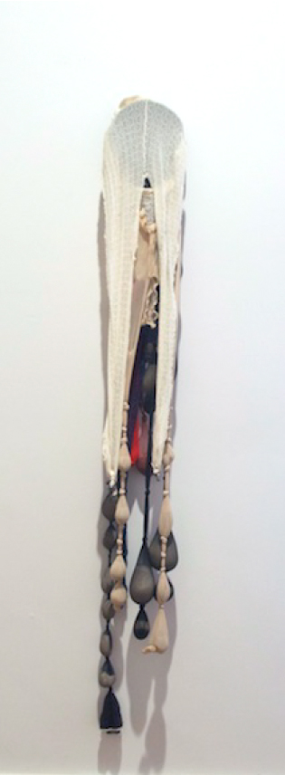 R.S.V.P. Reverie "C", 2014. Nylon mesh, sand and found object, 63 × 14 × 12 in. ">