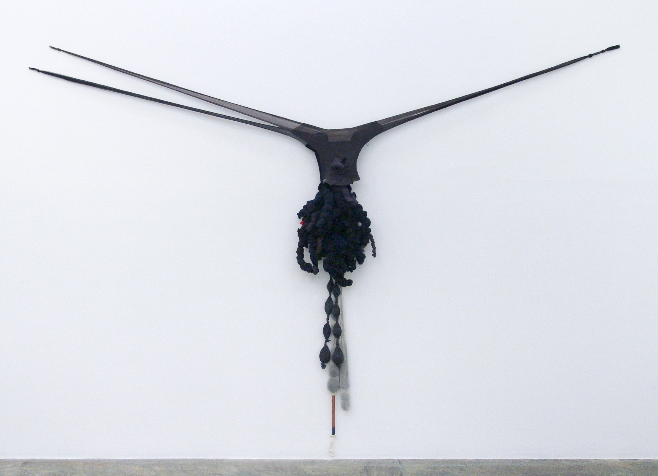 Bristle, 2013. Nylon mesh, broom, mixed media, 74.75 × 23 62.5 in.">