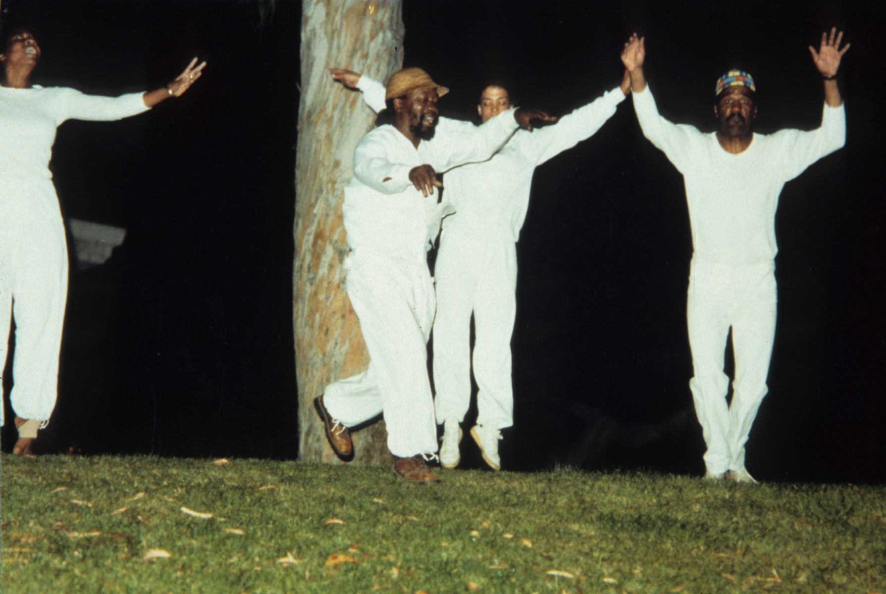 Performance Photographs - <i data-src=Freeway Fets, 1978. C-print, series of 11, 12 x 18 in each, edition of 5 (+1 AP). 'Through the CETA program, we were all able to make public art works. I chose to do a piece around the supporting columns of a freeway overpass right by the L.A. Convention Center. I liked this area because it gave me a sense of what parts of Africa might look like. It had a dirt floor with little palm tree shoots forcing their way through here and there. It was a place for those without homes to sleep. There were remnants of small campfires and sleeping bags under the shelf of the freeway overpass. I decided I wanted to celebrate and christen the space and my piece after it was hung. I was excited by the prospect of doing a public performance. To that date I had been content doing private studio art activities (performances) with only a photographer present as audience and documenter or with cohorts following through on ideas wherever they would lead us. 'Improvisation was the key. It opened the window to chance to let the soul/unconscious do its work.' (Maren Hassinger) At times, I collaborated with Houston Conwill, Maren Hassinger and Franklin Parker, and we would meet in different parts of Los Angeles, i.e. the Greek Theater when closed, an abandoned Catholic School’s swimming pool (site for the Performance “Rapunzel” in 1981), Exposition Park, etc. I really did not ask anyone in advance formally to participate in “Freeway Fets”. We did not rehearse. I knew the concept I wished to deal with, which was a reflection of the piece we were celebrating. Each column had nylon mesh forms wrapped around them. Some of the forms and columns were representative of male energy, the others of female energy. On one column I inscribed names of our children, on another the names of ancestors, relatives and personal friends, some of whom succumbed to the dis-ease of being black in America. I had grave concerns about the tenuous relationships between black men and women. I wished to portray myself as a uniting spirit, a harmonizing spirit between those two factions. I asked David Hammons to be representative of male energy and Maren Hassinger to be representative of female energy. I made my costume and the head dresses of all who participated and all who wanted one. David used an art staff, one of a series he was working on at the time. He also added a coat hanger under the headpiece I created for him to expand it. I asked my ‘Studio Z’ brothers - Roho, Joe Ray, Franklin Parker, and others - to bring instruments. We all converged on the place that morning. I cleared the air and the area with a palm branch, words, and water. I told everyone the concept - we put our “spirit heads” on and the music began. I had never danced with a mask on before. As I gave myself up to the music and the situation, I became other then myself. The concept took over and fulfilled itself. Besides the invited guest there were some onlookers from the street. One comment from an onlooker was that it was like looking at an African ritual and Kabuki at the same time. I was most pleased with this comment since I have been influenced by both, particularly at the same time.' Thomas Erben Gallery Exhibition info About the artist Menu Rapunzel, 1981. Silver gelatin print, 40 x 30 in, edition of 5 (+1 AP).Nylon mesh, human hair on wirFreeway Fets, 1978. C-print, series of 11, 12 x 18 in each, edition of 5 (+1 AP).Nylon mesh headdres Read content Freeway Fets, 1978. C-print, 12 x 18 in, edition of 5 (+1 AP). Documentation of performance and instFreeway Fets, 1978. C-print, 12 x 18 in, edition of 5 (+1 AP). Documentation of performance and instFreeway Fets, 1978. C-print, 12 x 18 in, edition of 5 (+1 AP).Documentation of performance and insta Freeway Fets, 1978. C-print, 12 x 18 in, edition of 5 (+1 AP). Documentation of performance and inst 1 2 3 4 ">