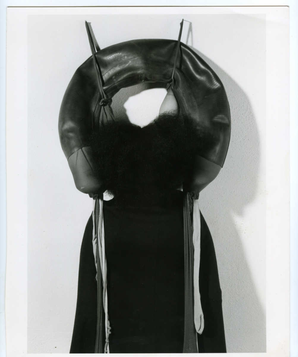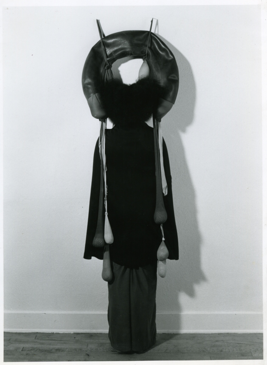 Performance with 'Inside/Outside,' 1977. Silver gelatin print, 40 x 30 in, edition of 5 (+1 AP). The sculpture Inside/Outside: nylon mesh, rubber, foam Photo: Ken Peterson <i>Performance with 'Inside/Outside,'</i> 1977. Silver gelatin print, 40 x 30