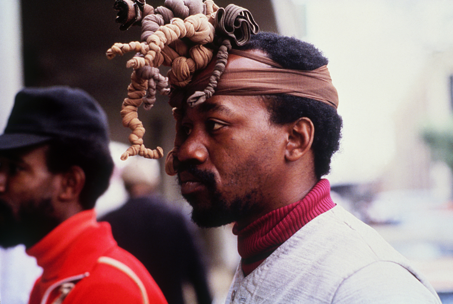 I really did not ask anyone in advance formally to participate in “Freeway Fets”. We did not rehearse. I knew the concept I wished to deal with, which was a reflection of the piece we were celebrating. Each column had nylon mesh forms wrapped around them. Some of the forms and columns were representative of male energy, the others of female energy. On one column I inscribed names of our children, on another the names of ancestors, relatives and personal friends, some of whom succumbed to the dis-ease of being black in America. I had grave concerns about the tenuous relationships between black men and women. I wished to portray myself as a uniting spirit, a harmonizing spirit between those two factions. I asked David Hammons to be representative of male energy and Maren Hassinger to be representative of female energy. I made my costume and the head dresses of all who participated and all who wanted one. David used an art staff, one of a series he was working on at the time. He also added a coat hanger under the headpiece I created for him to expand it. I asked my ‘Studio Z’ brothers - Roho, Joe Ray, Franklin Parker, and others - to bring instruments.