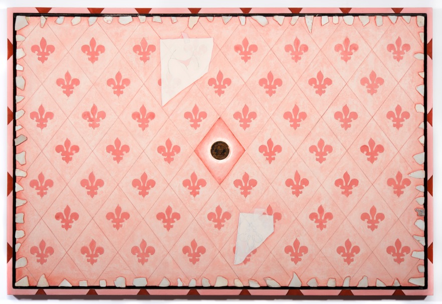 PINKIE (Towards 80), 2014. Oil and graphite on wood, ceramic shards, brass bezel, and found object, 25 1/2 x 37 1/2 in. ">