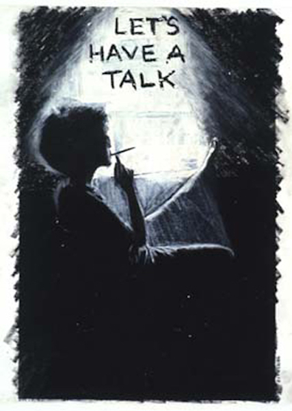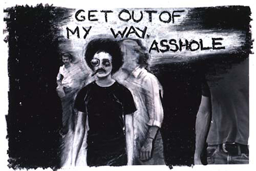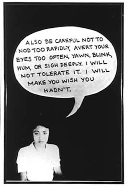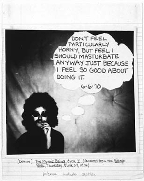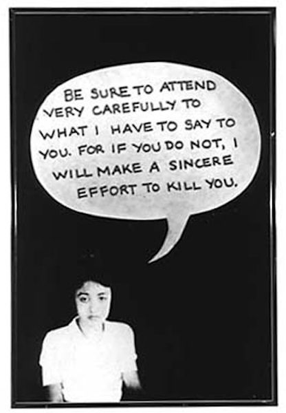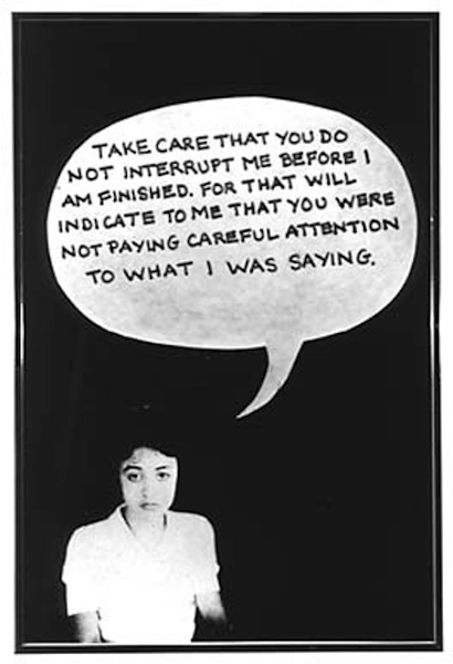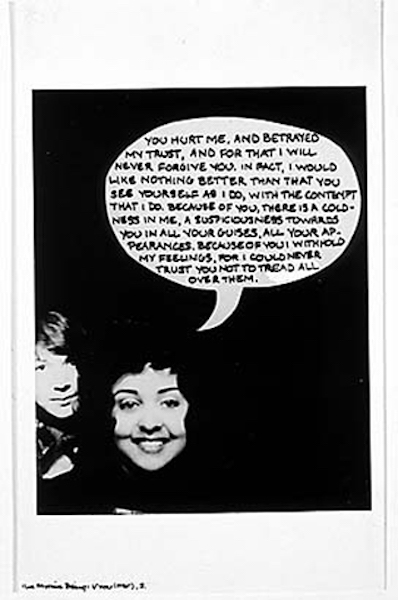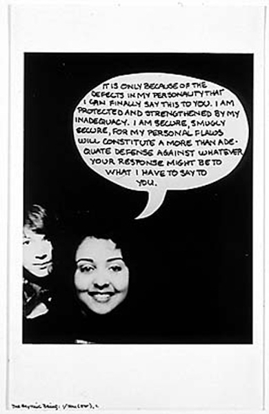 I / You (Her) from 1974 is a series of 10 altered photographs with drawn speech ‘balloons’, charting the transformation of a single photograph of Piper as it gradually takes on the features of The Mythic Being. The accompanying balloons are filled with a text/monologue expressing disappointment with and an increasing hardness and very personal anger towards an unnamed betrayer. In this piece, the ‘character’ of The Mythic Being escapes his beginnings as an idea of Adrian Piper and becomes a fully and psychologically independent figure.