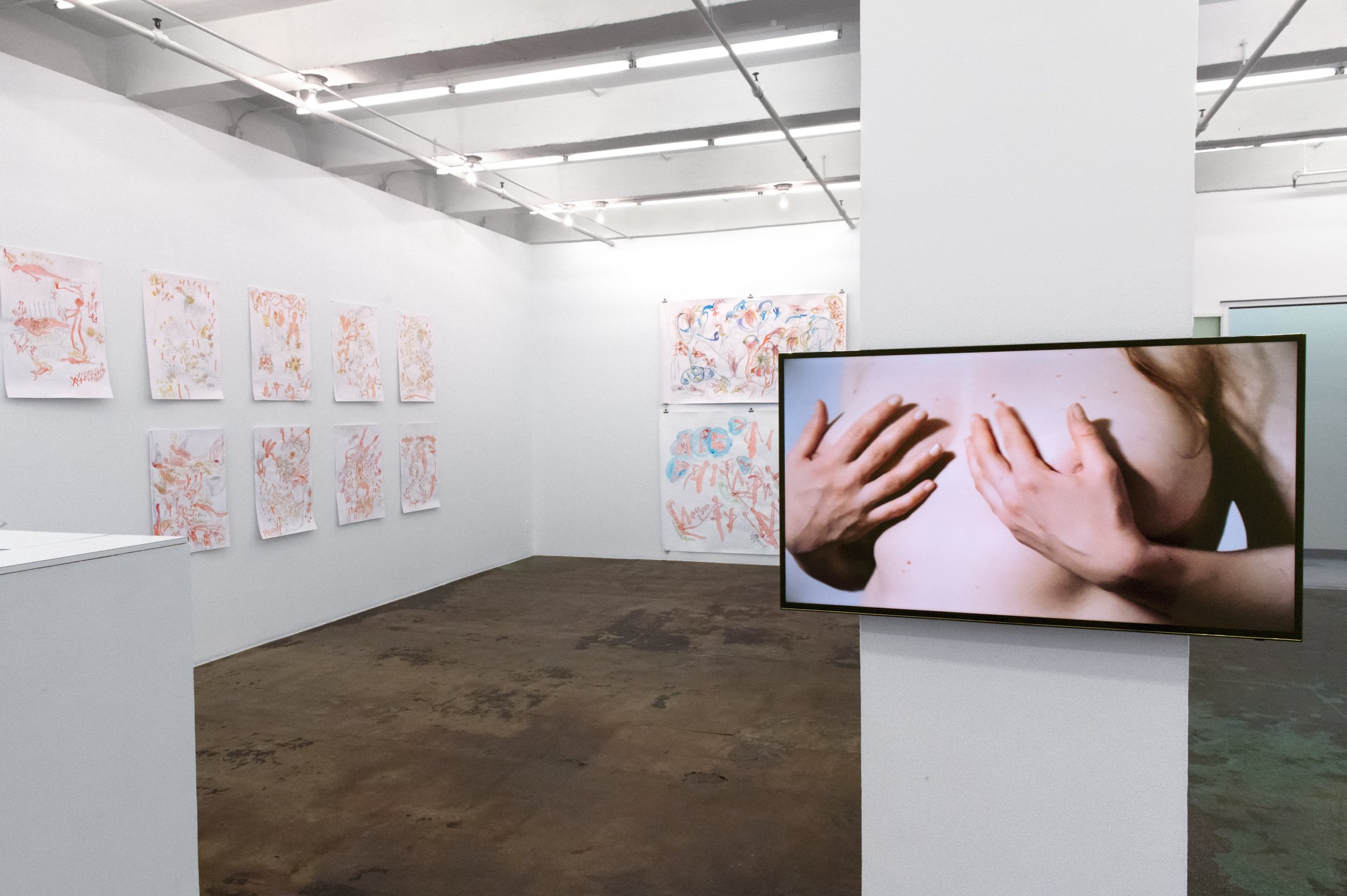 At Manifesta, Györi presented Vibration Highway, an impressive group of “Masturbation Portraits”: large scale works on paper drawn in private sessions with women, who — in “an act of playing together” (Györi) — were invited to pleasure themselves. Corresponding fantasies are documented in equally sized Phantasy Analysis, with both drawings displayed together, as is the case with Woman 4 (included in the exhibition). Additional drawings are grouped under such titles as Exercises and Movements, Experiences from Childhood, and Expedition: Get to Know Your Genitals (on view) to complete the cycle, resulting in an analysis of – and guidebook to – female self-pleasure.