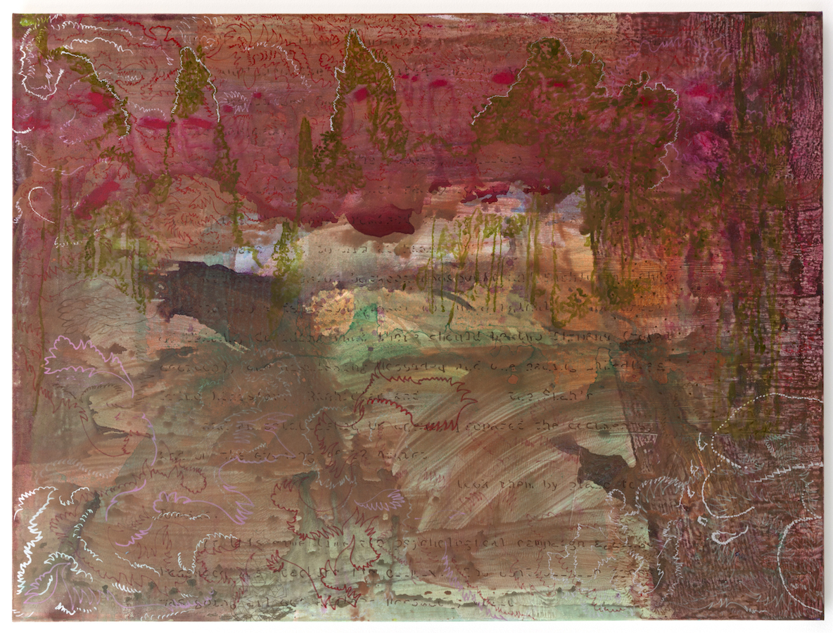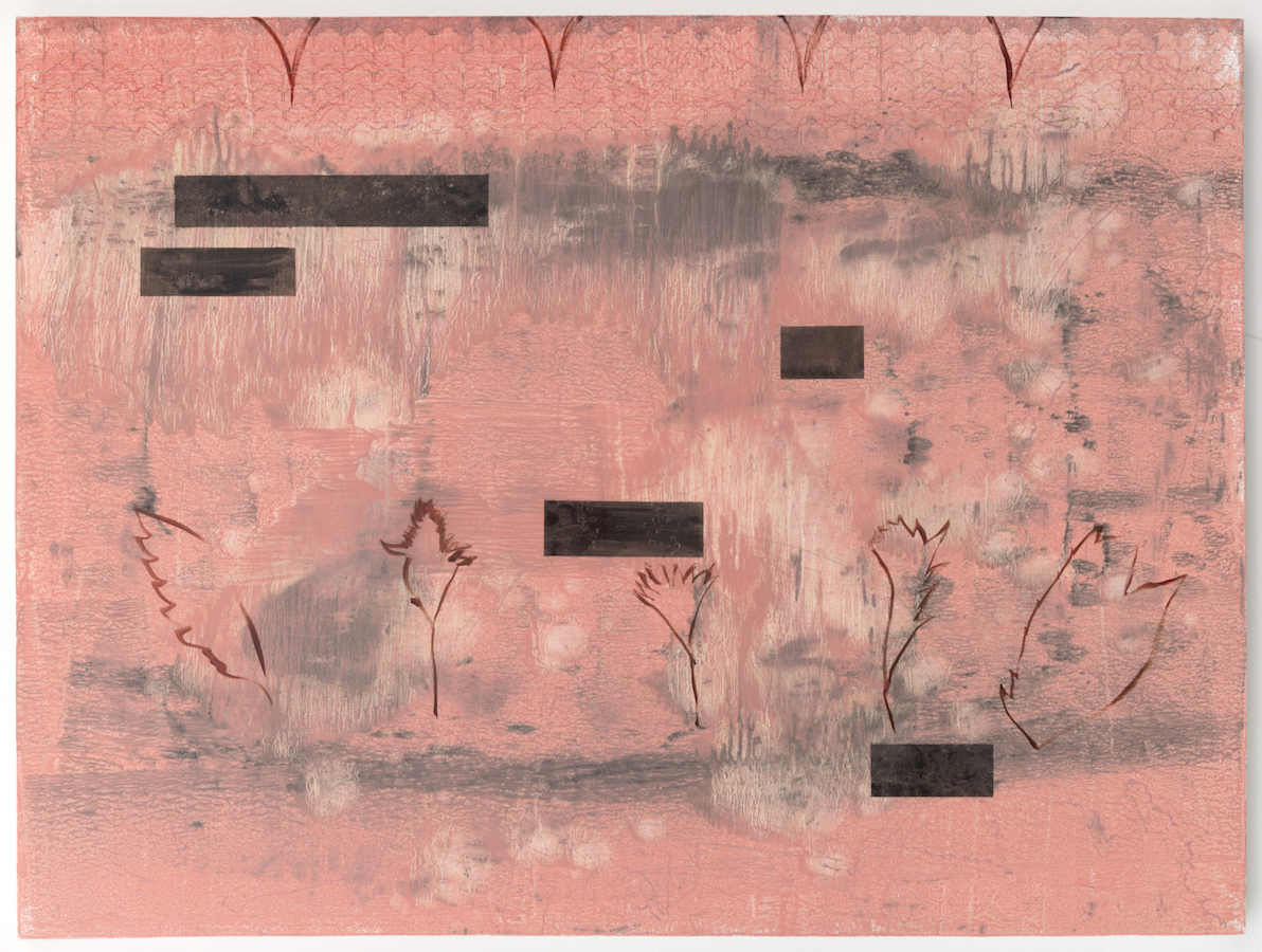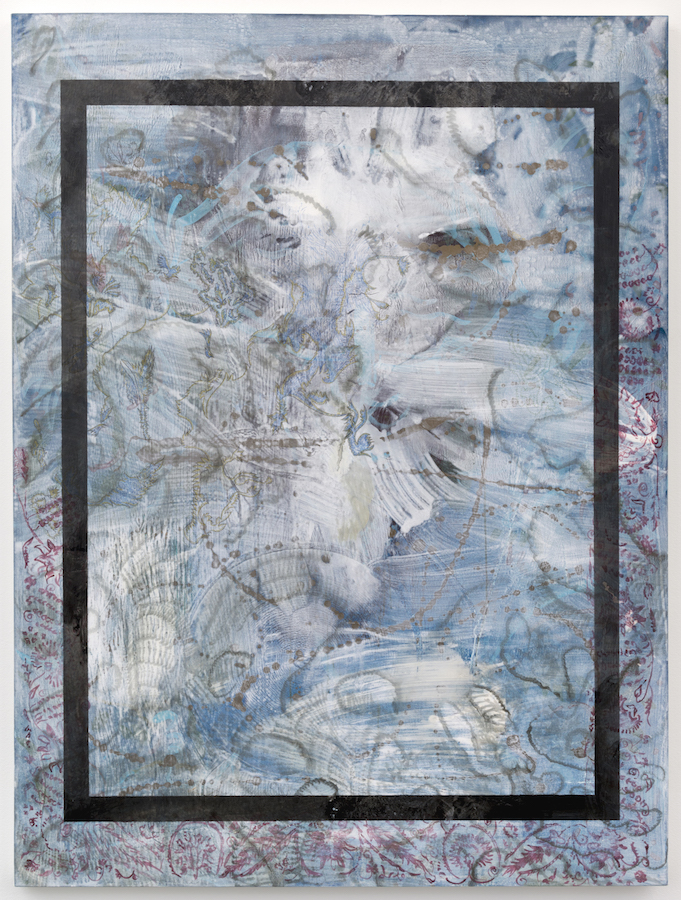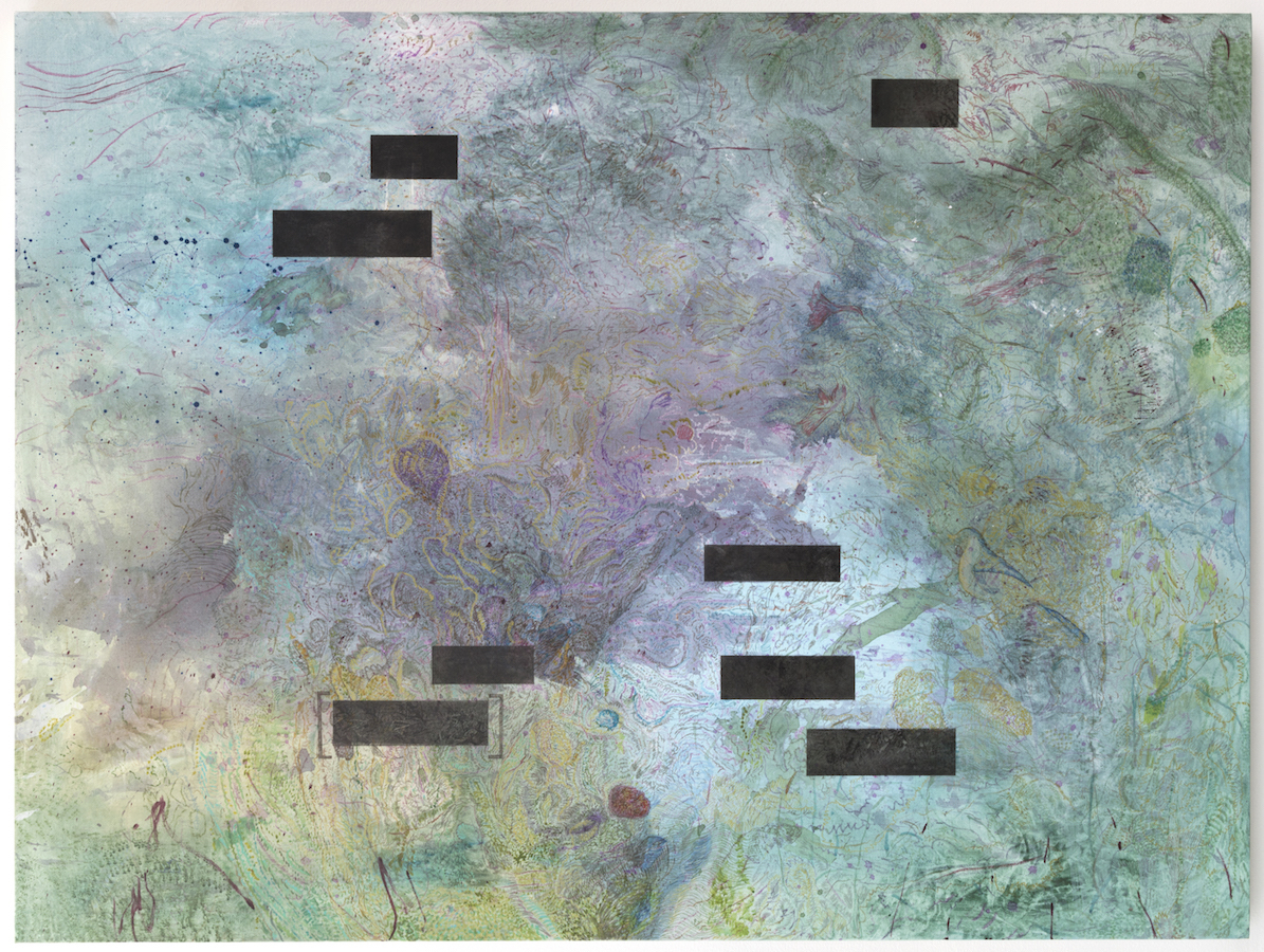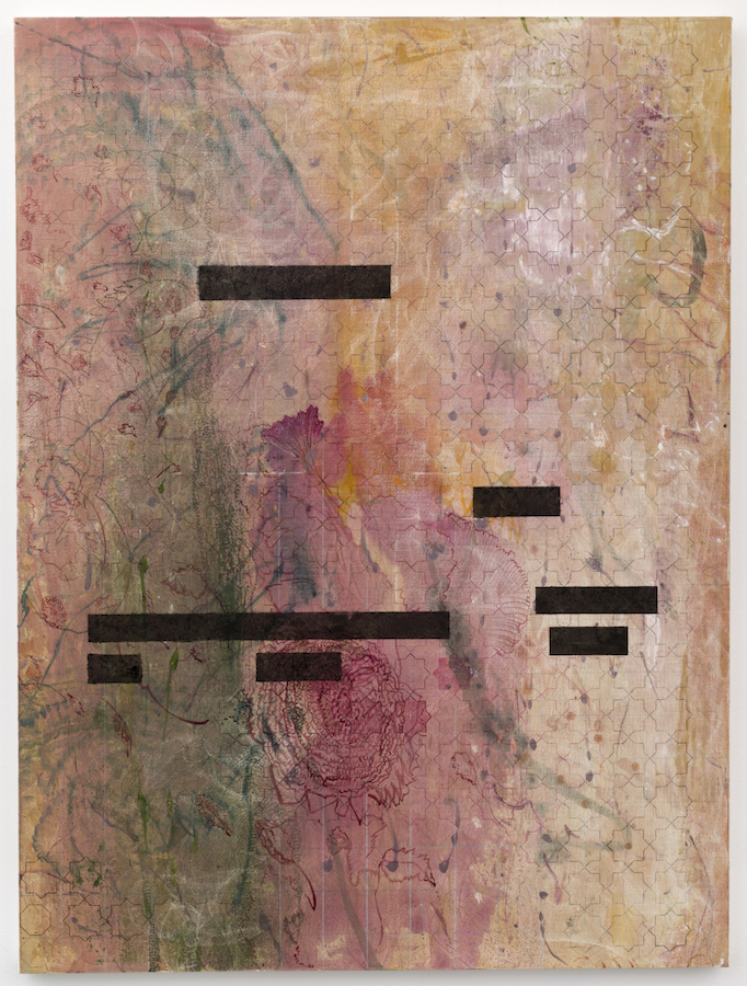The exhibition also contains a suite of paintings that contain finely articulated motifs, drawing from site plans of gardens, floral paintings of 19th century illuminated books, the ritual geometry of architectural patterns, and inscrutable characters. Behbahani plays off the idea of secrecy in her paintings, combining her imagery with washes of color that simultaneously illuminate the field of the painting and obscure what is contained beneath. She transposes the redaction bars from pages of the Wilber report onto her own works, suppressing information about the paintings. The beauty, detail, and labor of the work is permeated with secret codes and poetic withholding. Behbahani plays with coding and decoding this repressed history, making visual poetry out of its redactions.