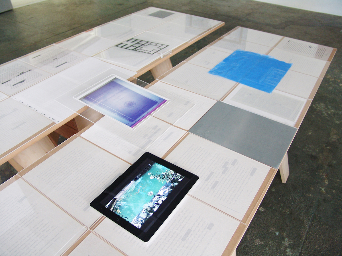 For Garden Coup, Behbahani installs a broad table within the gallery, upon which pages of the report are stacked and only partly revealed. Some are hidden beneath watermarked papers, others have been covered in drawings. One stack is topped by a plate of zinc, another by an architectural etching. At the center of the table is a reproduction of the cover of The Persian Garden, an exhibition organized by Wilber in 1940 for the Iranian Institute in New York. Behbahani’s interests in duality and duplicity become clear through her research process, by which she investigates the interlinked aspects of Wilber’s interest in Persian gardens and his role as the architect of the coup. Persian gardens, after all, exist within an arid environment where water is scarce, making the richness of their greenery and fountains all the more impressive. These gardens, like the installation itself, are centered around process. While aesthetic objects themselves, the gardens also privilege experience, being able to sit and contemplate, listen to water, and hear nightingales.