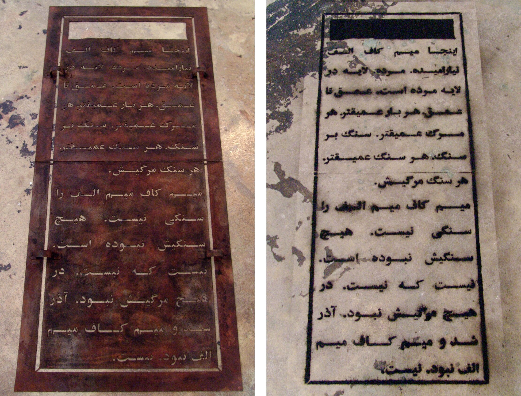 Tombstone of Barbad Golshiri, 2012. Engraving on stone, 47.5 x 20 x 3 in.">