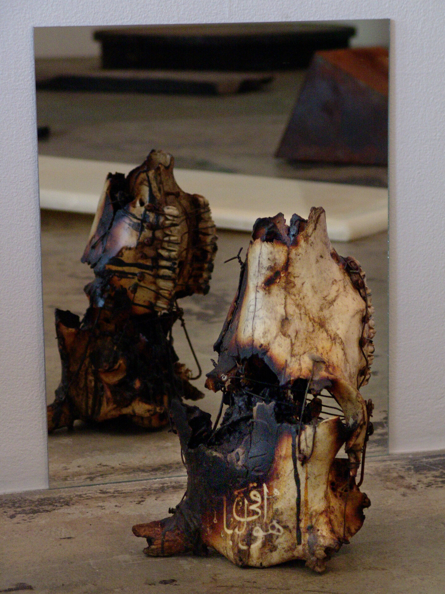 Considering the urgent presence of the body, with all its most primal and visceral functions, death has played an important if understated part throughout Golshiri’s art. In Curriculum Mortis, it becomes the main theme through which all other aspects are filtered, as physical bodies are replaced with tombstones, turning the gallery into a graveyard. How do we deal with the loss of those close to us, when they are killed under unclear circumstances, in a society where no authority can be trusted? Golshiri approaches each death individually, creating grave markers so closely attuned as to become physical manifestations of the people they commemorate. Tombstone for Borges’ Assassinated Translator, for example, incorporates engravings referring to the stories translated by Ahmad Mir-Alaei, a well known writer who disappeared and was later found dead, allegedly from cardiac arrest. By creating these tombstones, Golshiri gives voice to those whose words have forcibly been taken from us, and gives them a renewed physical presence in the world, refusing to forget.