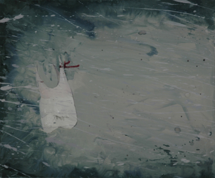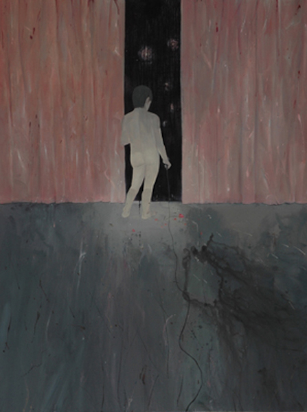 Though Wei Jia’s work also concerns itself with exterior, physical threats, often in the tangible form of guns and knives, his focus falls upon the shadowy realms his endangered, solitary characters inhabit. While these surroundings possess both architectural and natural elements, an overriding contextual emptiness leaves viewers with the sense of having visited a limbo – not a space, but a space between – where violence exists with unchecked, un-judged supremacy. Jia’s expansive, watery works in shades of gray, pink, violet and black are awash in gothic, vaguely mystical scenarios that resist resolution.