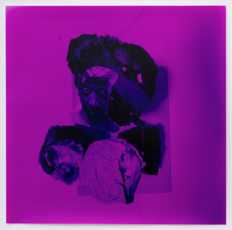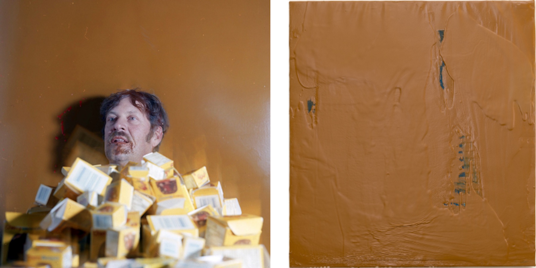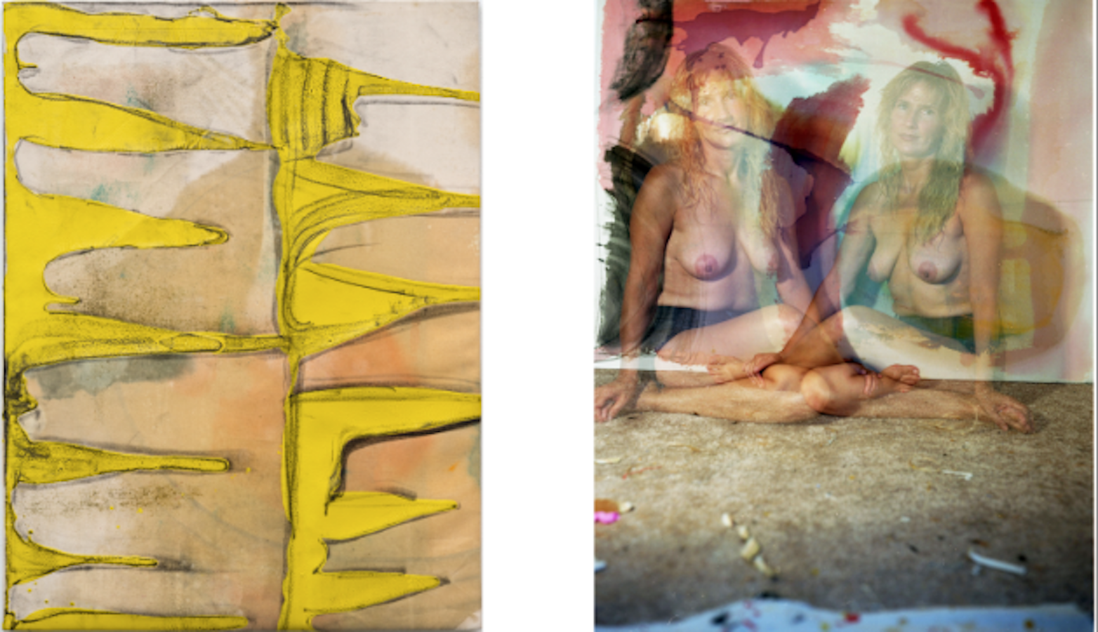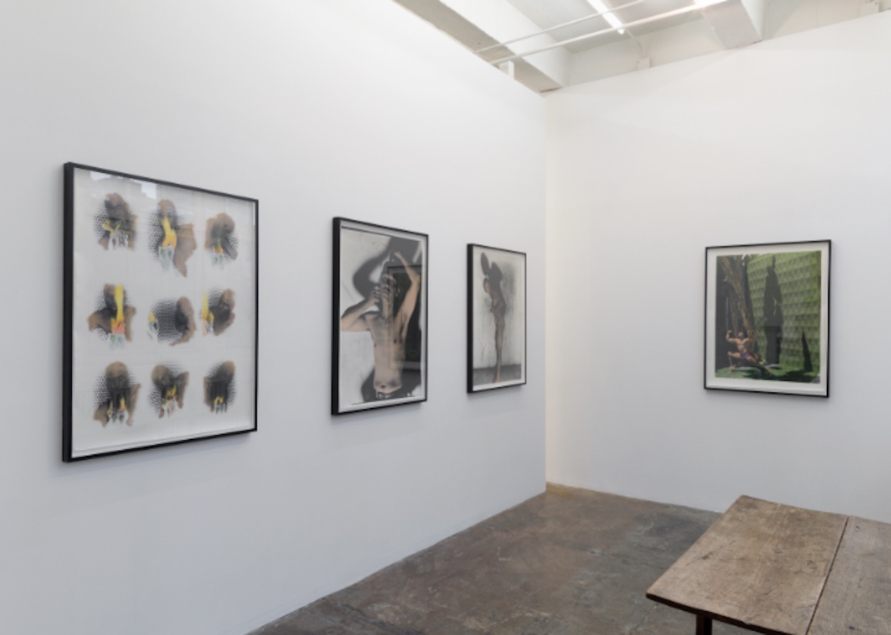 Cherry Blossom portrays a man’s head as the apex of a pile of candy boxes. He is positioned in front of a brown background, with red drips contouring his shadow. Displayed beside is a painting of the same color, which serves as a physical extension of the photograph’s backdrop. In Mikki, a nude woman appears mirrored partly on top of herself; her twinned, transparent bodies seeming to absorb the stained marks on the painting behind her.