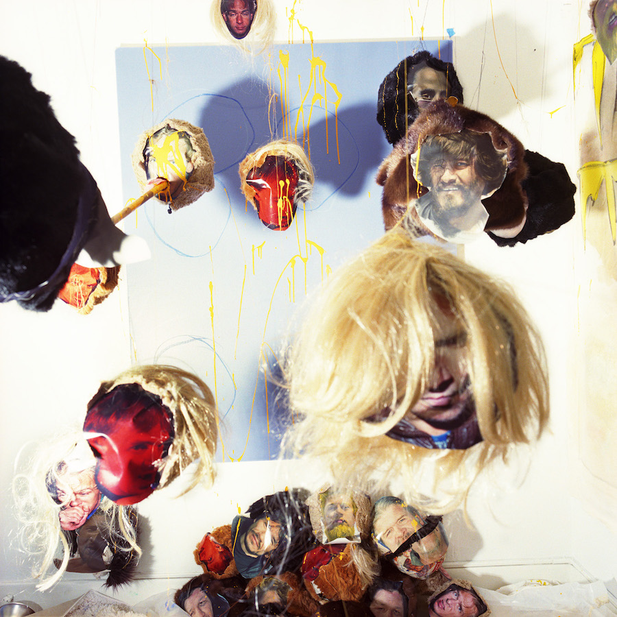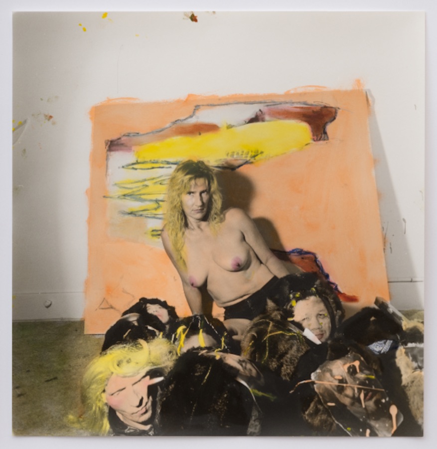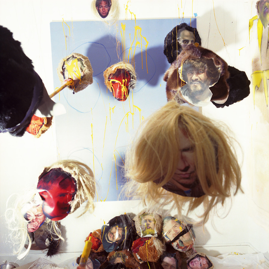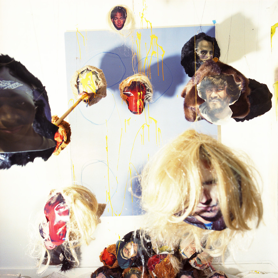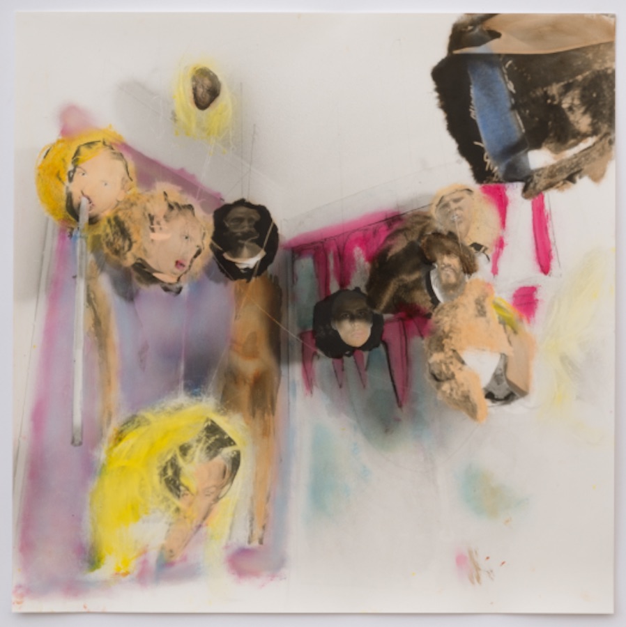 In the central triptych of the exhibition – Untitled I, II and III – large square photographs depict clusters of heads, tense crowds in which each member holds a different expression. Stocki selected portraits from her archive, applying them to fur covered lumps to create sculptural heads that are suspended from the ceiling of her studio. The ramshackle crowd is framed by an unfinished painting, existing in an environment that has been splattered throughout. The three photographs vary subtly in composition as well as deteriorated color and are displayed on a golden wall. This veneer of decadence is in contrast to Stocki’s subjects, which are neither the groups of angels portrayed within Baroque churches, nor the inhabitants of a world of material luxury. Hanging by a string, these forms recall not opulence, but precarity.