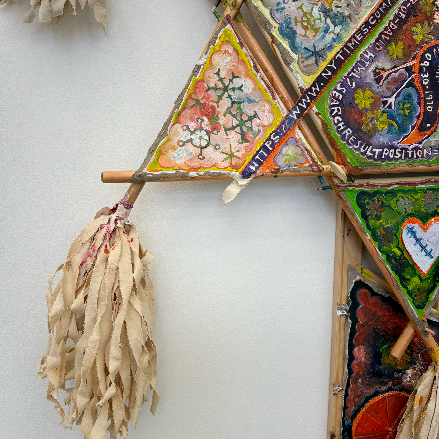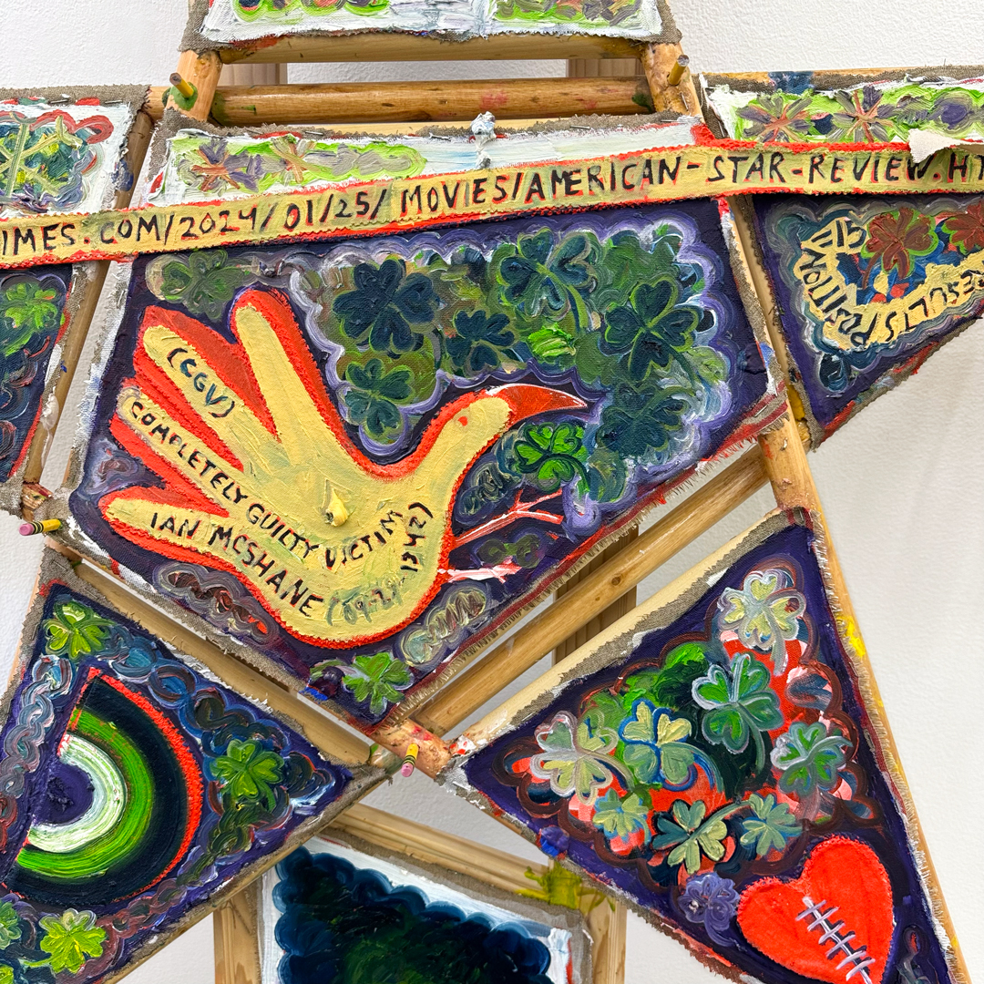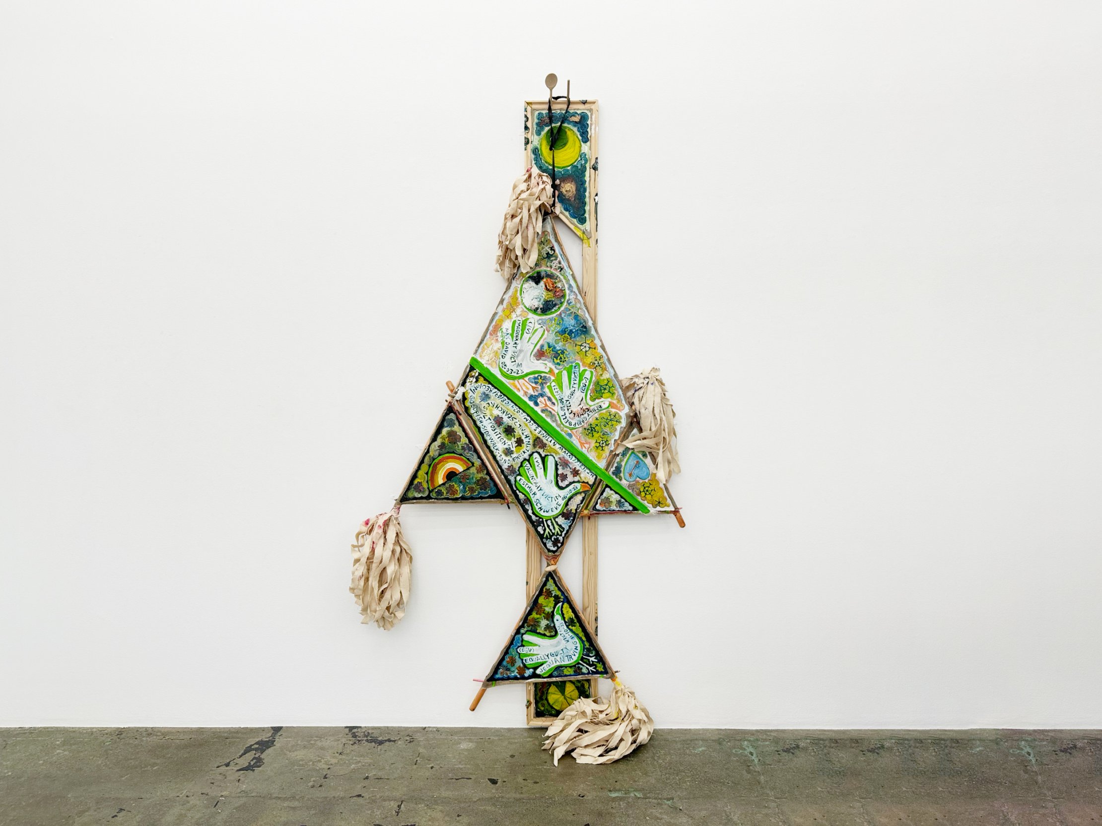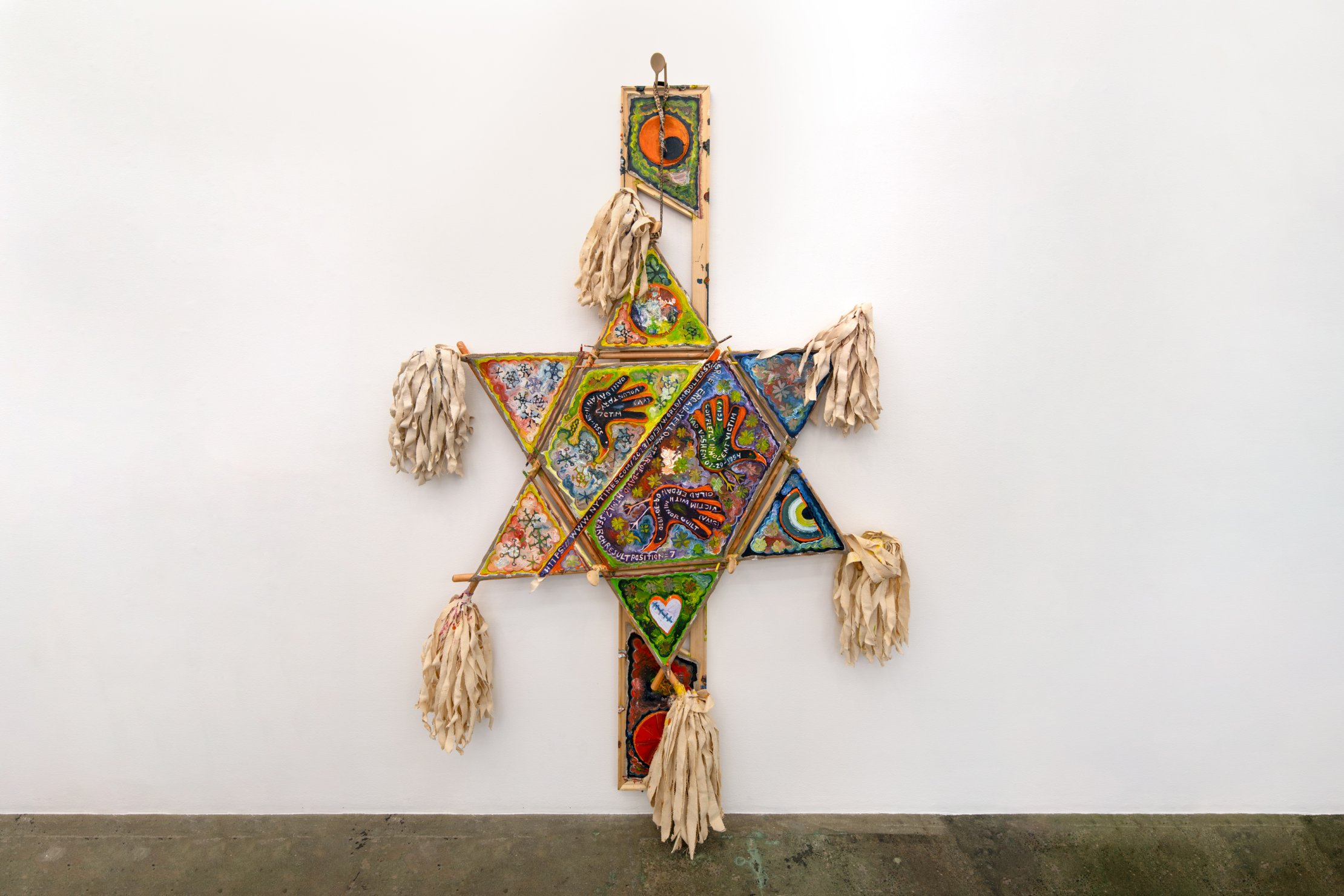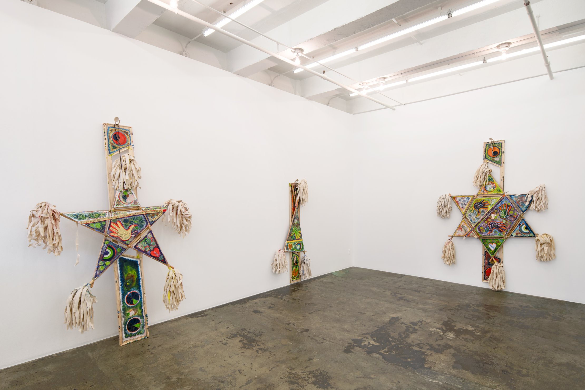 In these new paintings, Cloud replaces traditional wooden stretcher bars with handmade mops, which he has fashioned from broomsticks and tattered canvas strips. These mops are structural elements taking on the shapes of stars, arrows, fish or others.