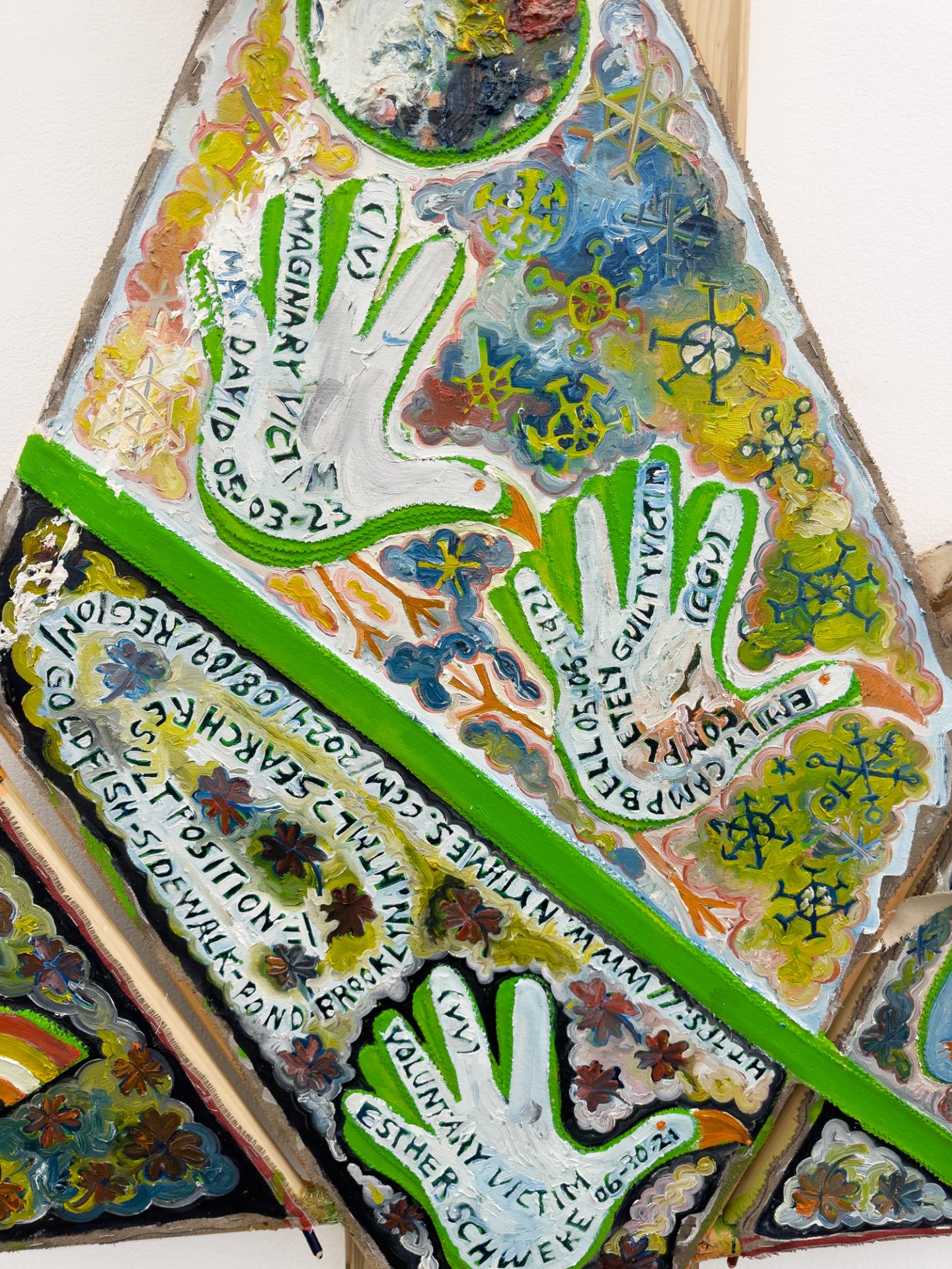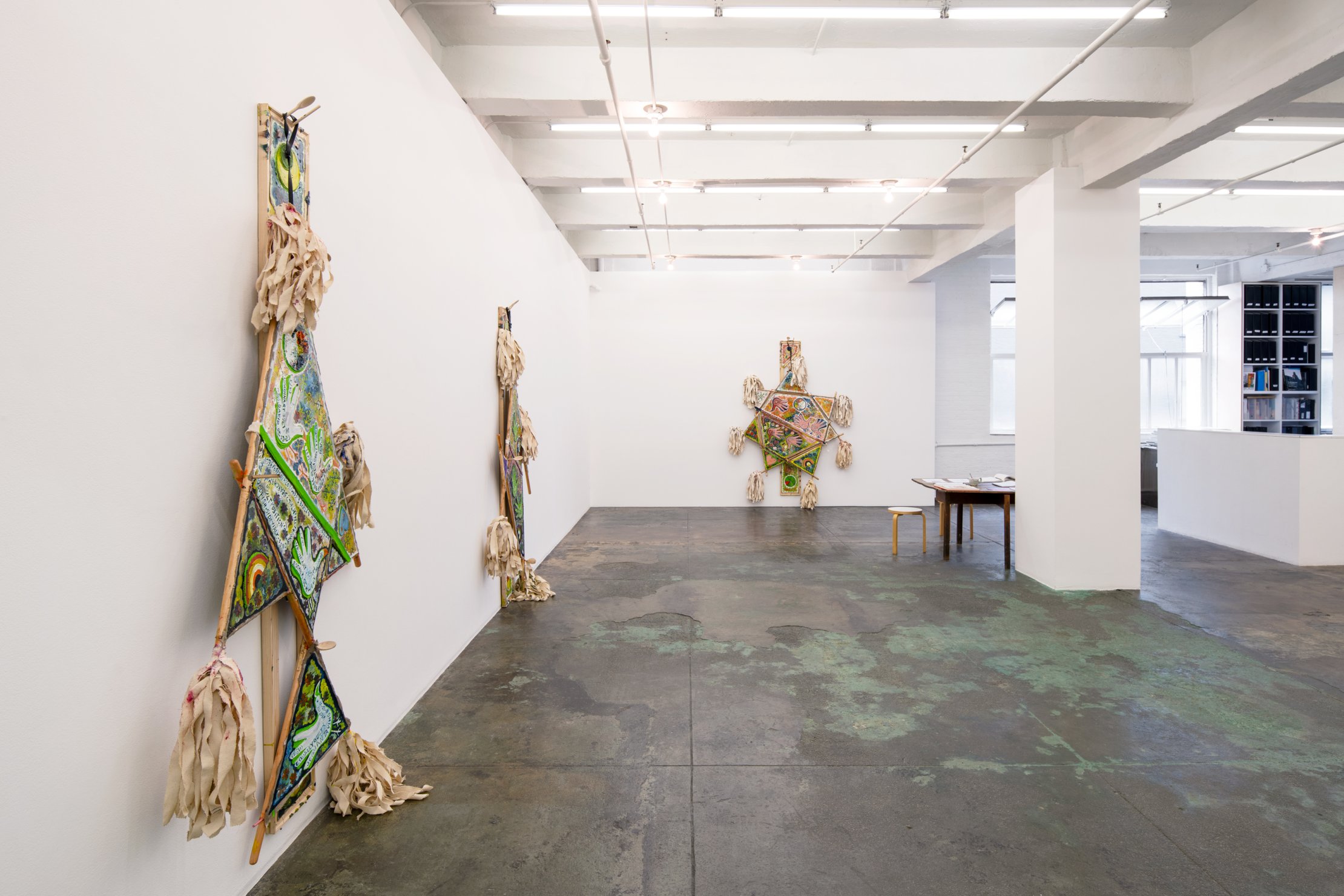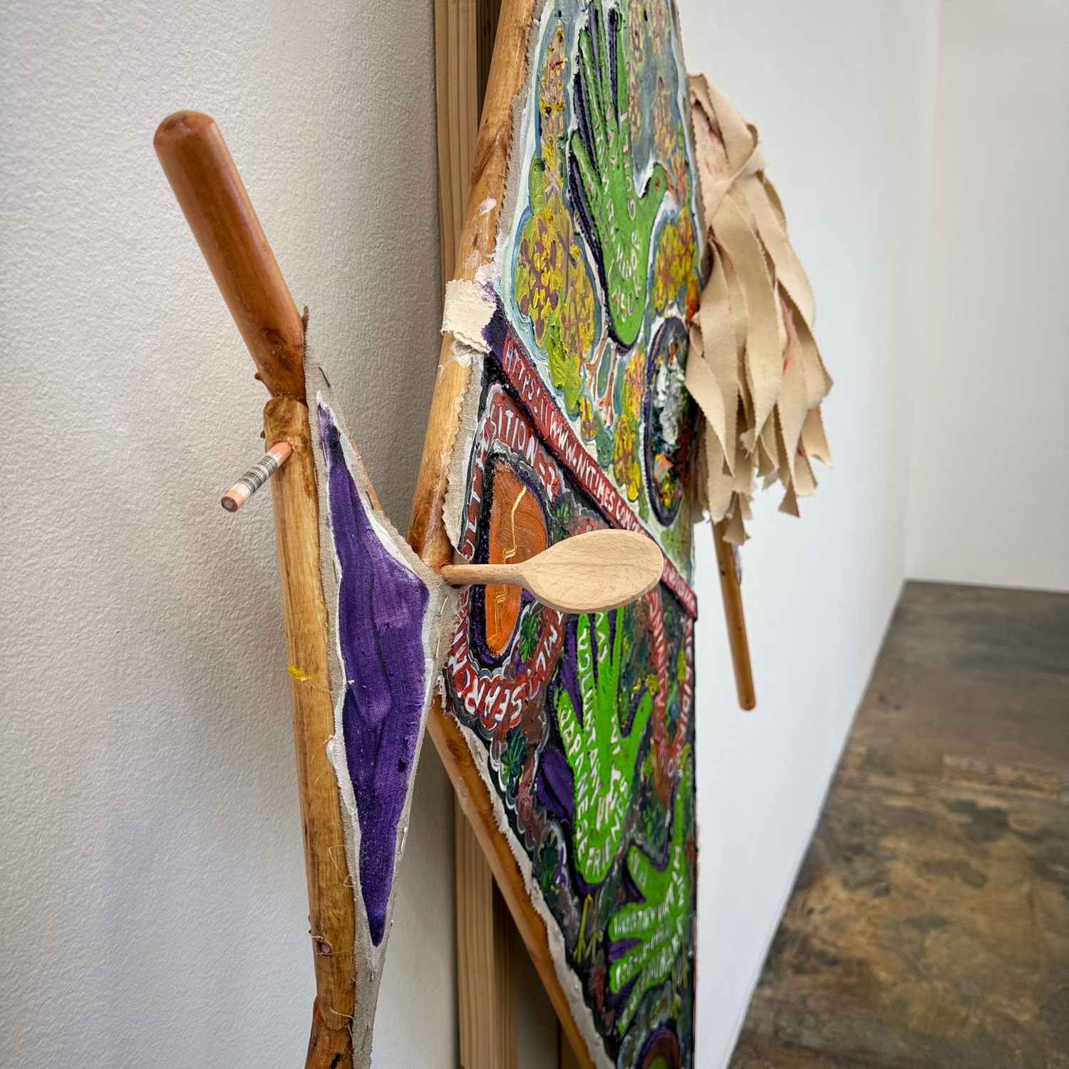 The artist has used totemic shapes as painting structures before, but here the paintings resist hanging flat against the wall to a degree that transmutes the works into “standards”, portable flags or signs that can be carried into different contexts, such as battles, processions or protests.