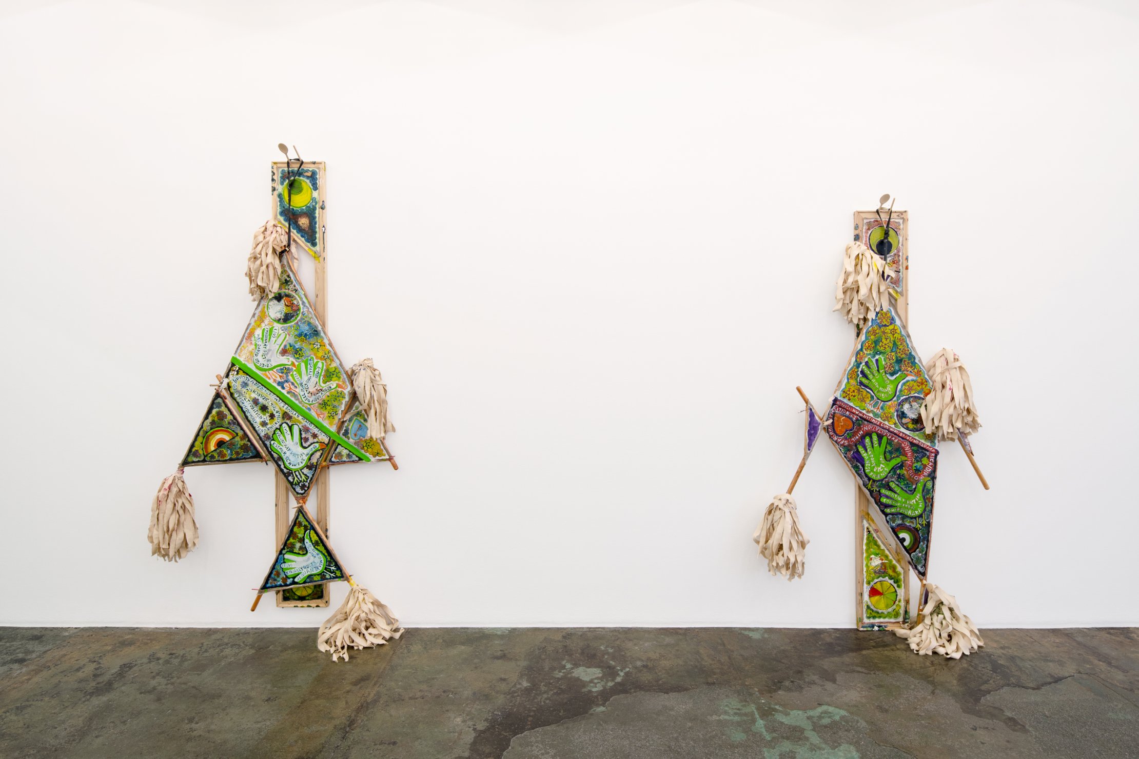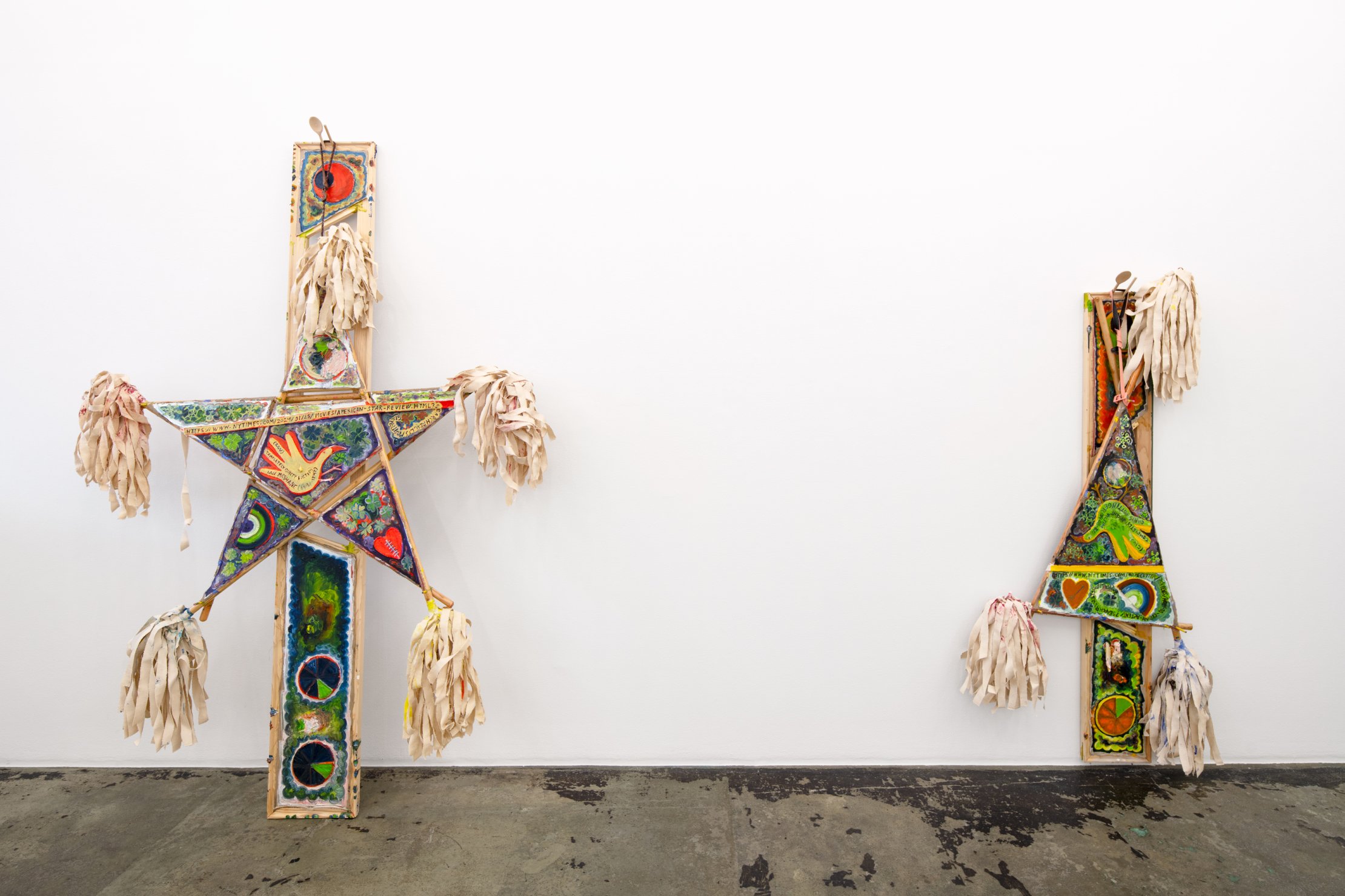 The mop structures crisscross at irregular angles and often multiple times, creating mosaic-like, collaged surfaces describing iconic forms. The extending mop heads bestow an air which veers between festive and ridiculous, pom poms and scare crows and also allude to the African American wedding tradition of “jumping the broom”.