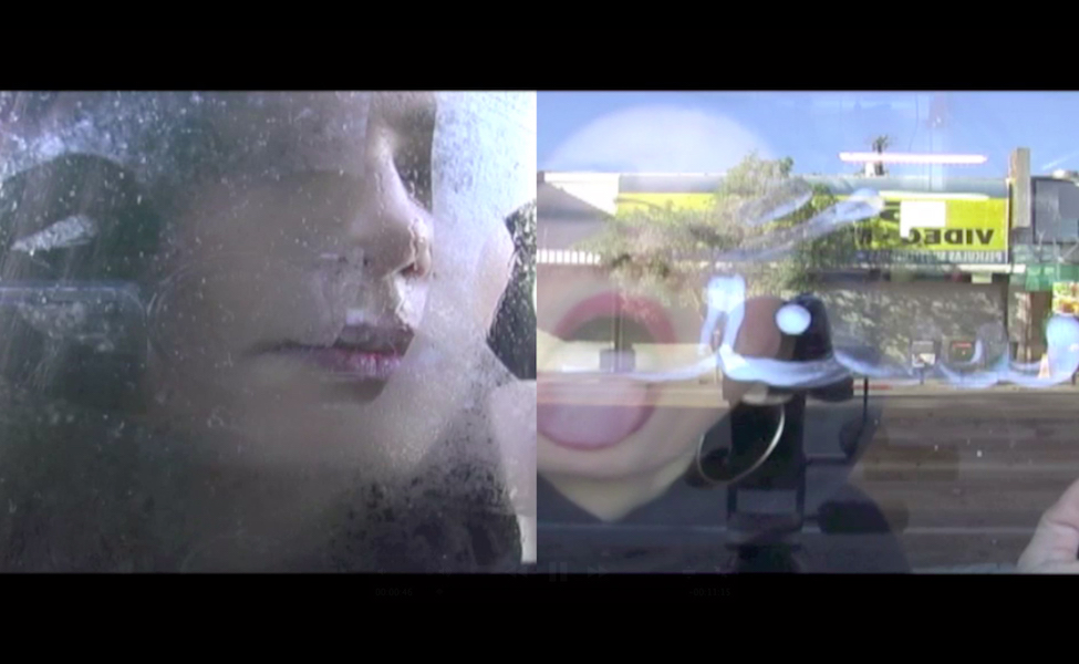 Amitis Motevalli: Love Letters to Jeremy/Let Them Eat Yellowcake, 2011. Video, 12:00 min, image courtesy the artist and OtherIS. Love Letters to Jeremy/Let Them Eat Yellowcake* is a video derived from a performance, conceived in two parts to be shown simultaneously in Iran and outside Iran (the first simultaneous showing was to be in March 2011 at Aaran gallery, Tehran, and Morono Kiang gallery, Los Angeles, as part of My Superhero exhibition curated by Nazila Noebashari; only the “outside” segment has been shown there). In Part I, I am on the outside of a window looking in. I steam the window with my breath and write words backward onto the glass, English words such as on-the-edge and tee-ter, that indicate a position that does not fit-in or conform to a standard. As each word sequence begins to fade, I wipe it with my hand and blow onto the window to write again. With each word, I become light-headed due to the heavy breathing. In Part II, I perform inside the café looking out. I write backward in Farsi with whipped cream onto the window in order to communicate with the outside. The words that I write play with language and have multiple meanings. After each word is written, I lick the cream off of the window. With this set of words, I maintain a certainty and awareness. Words with specific connotations are used to engage the viewers and place them either inside or outside the window. When writing Farsi, I am inside, you are out. When writing English, I am outside, you are in. Regardless of position, context, and environment, I initiate a dialogue; in Part I, it leaves me breathless, in Part II, it nourishes me. * Yellowcake is slang for Uranium. Amitis Motevalli: Love Letters to Jeremy/Let Them Eat Yellowcake, 2011. Video, 12:00 min, image courtesy the artist and OtherIS.