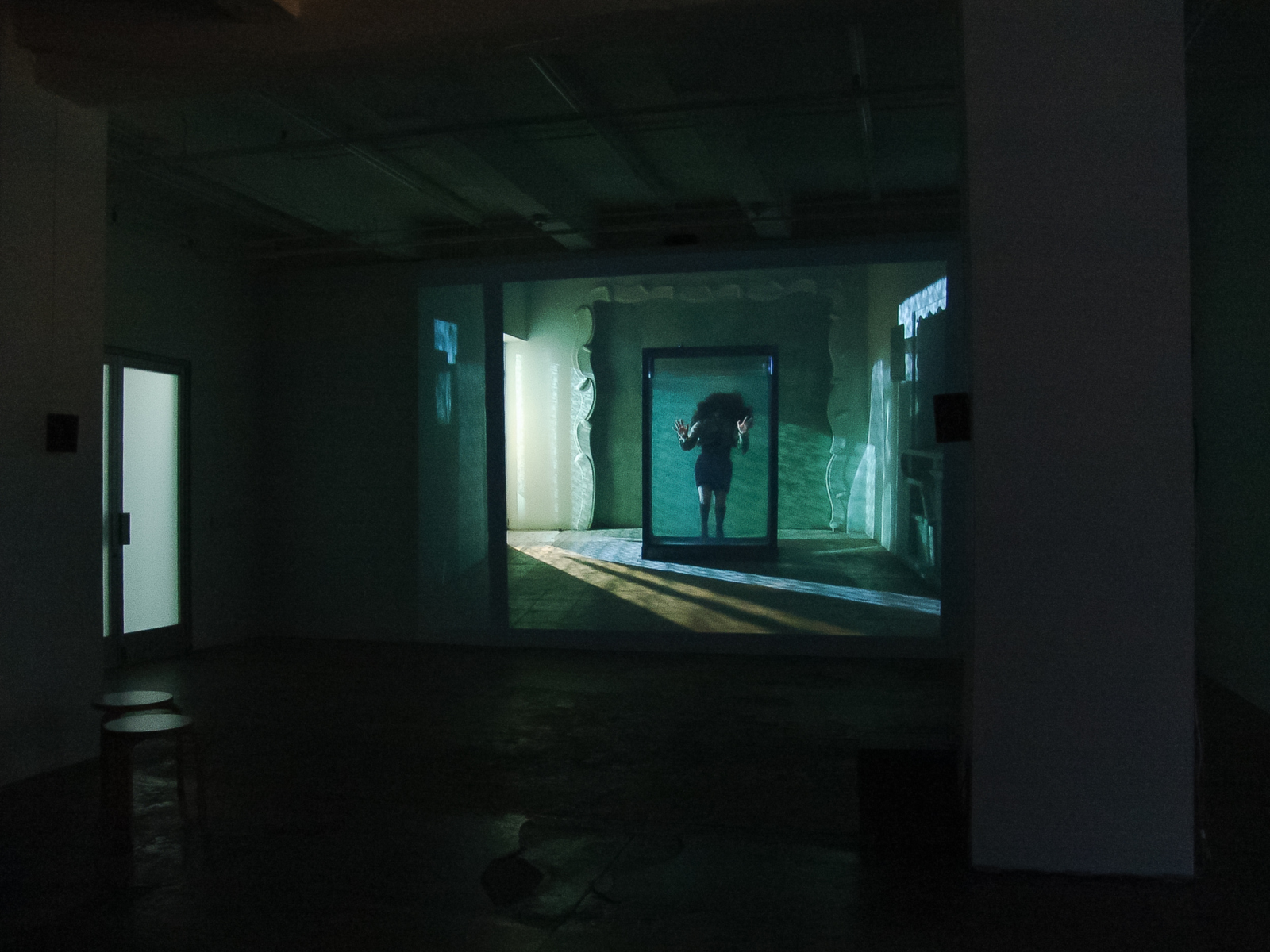 In both her paintings and video works, Bahar Behbahani addresses volatility of references to a specific place — since her work is autobiographical, this place is Iran of her experience — but personal memories are continuously reconfigured, and inserted back into the in history of the place which is remembered, via artistic practice, which serves as distancing device and as lens though which these deep feelings of displacement and longing can be conveyed. In Saffron Tea, as she is submerged in a large water tank, we see her, suffocating in the water; but we also see what she sees from this confinement, through the water ripples and mnemonic distortions — a well-appointed living room, with shimmering warm light, fruit and crystal, and elderly women fanning themselves in summer’s heat. Incongruity of this divided vision is emphasized by cool empty space in which the water tank is placed, a kind of capsule of existence, which is self-contained.