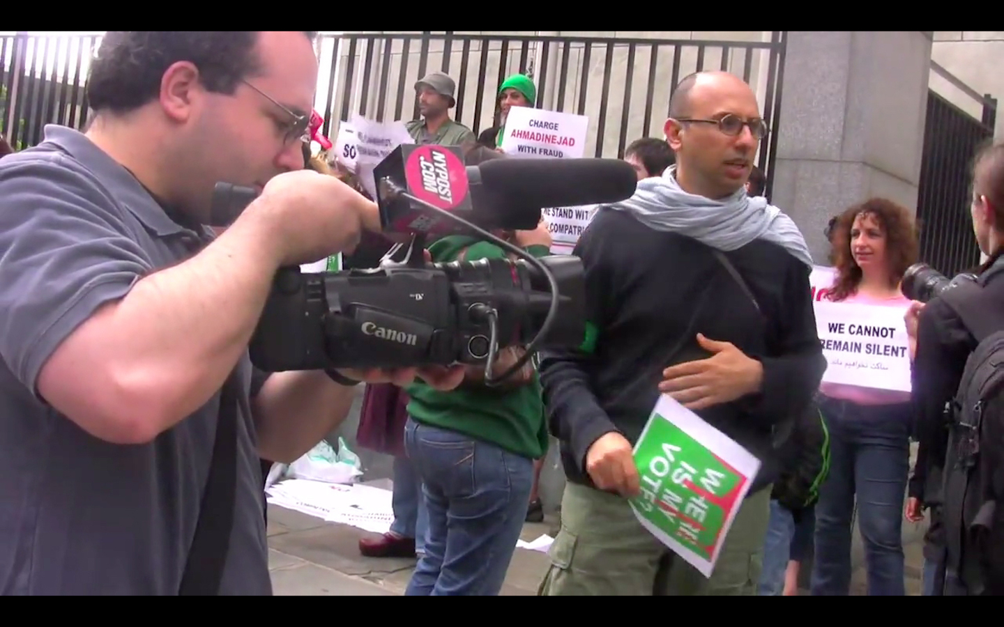 Katayoun Vaziri: Shout for Me, 2009. Video,8:40 min, image courtesy the artist and OtherIS. 2009 was the year of Iran's contested Presidential elections that prompted protests both inside and outside Iran. Shout for Me depicts the first protest that occurred in front of the UN in New York, and follows not the protesters but rather the cameramen and women who film them. Many news agencies covered the event - each camera focusing on different aspects of the protest. Some journalists interviewed the protesters, others captured the chanting or snapped poignant images. Cameras, booms, cords, cases - the images showcase the technology involved in documenting the event. The viewer becomes cognizant of how an event is captured, recorded, and distributed. A coiffed and made-up announcer recites a headline with stereotypical phrasing, "Their protest is small, but their message is coming across loud and clear." The viewer witnesses the construction of the media, as it questions the relationship between observer and observed. Katayoun Vaziri: Shout for Me, 2009. Video,8:40 min, image courtesy the artist and OtherIS.