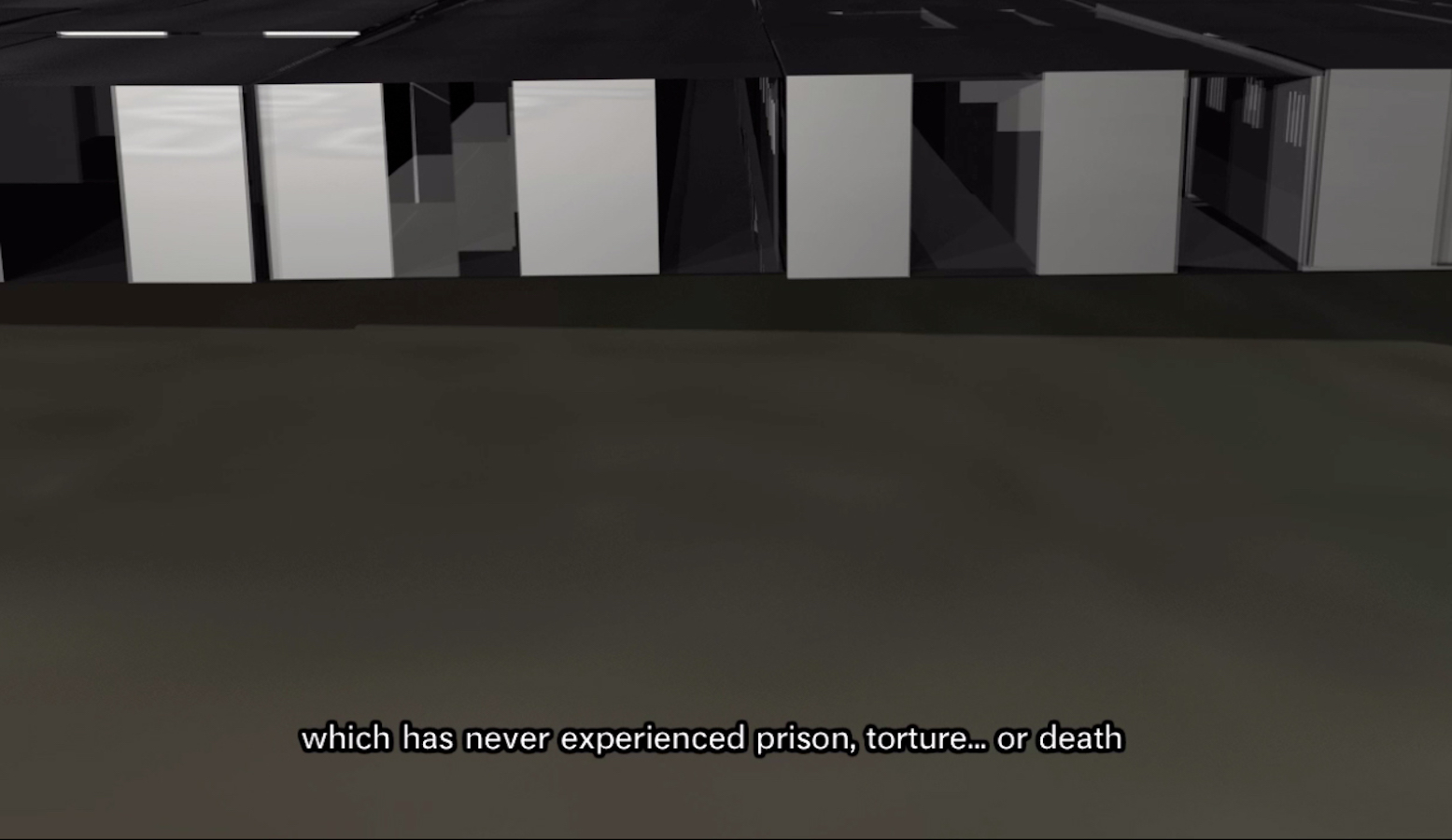 Morehshin Allahyari: Over There is Over Here, 2010. Video, 5:06 min. Over There Is Over Here explores the dialectics of time and space, real and imaginary, to address the position of those who have left Iran in recent years in relation to the position of current political prisoners in Iran. The project uses 3D animation and data glitch as a way to emphasize the absence of the presence in collapsible time sequence. A found photo of political prisoners is perhaps hundred years old, but as the prisoners in it are chained to each other, so the past is chained to its present, generation after generation. The animation starts with the images of political prisoners from the past, but the names called are those of prisoners currently in solitary confinement in Iran, located in Azadi Square in Tehran (azadi means freedom); the same square where protests took place during the Green Movement in 2009. The narrator of Over There Is Over Here alternates between the neutral third person position and the actual position of the author — the artist telling her story out of Iran, while many of her friends and classmates remain imprisoned. The artist casts herself as outsider —but also outside the prison walls. Morehshin Allahyari: Over There is Over Here, 2010. Video, 5:06 min.