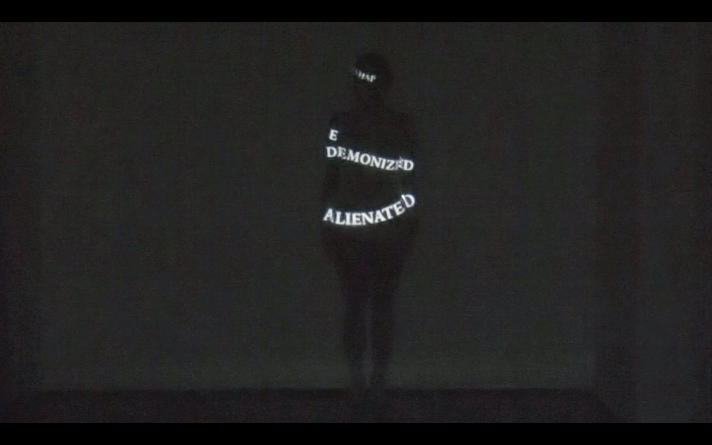 Shay Mazloom: Blank Surface, 2010. Video, 2:44 min, image courtesy the artist and OtherIS. Blank Surface is a work about the effects of social discourse on individuals, and incorporates language as a critical element of knowledge and power affecting identity. Words from texts describing the female body scroll across the surface and around the silhouette of the artist's own body like a snake or a laser-like scanning device searching for a vulnerable crevice or opening. In live performance, the viewer is a silent witness to the scene. Just as the artist is passive, and the words active, searching and defining, so the audience, too, is confined to the role of observers. Shay Mazloom: Blank Surface, 2010. Video, 2:44 min, image courtesy the artist and OtherIS.