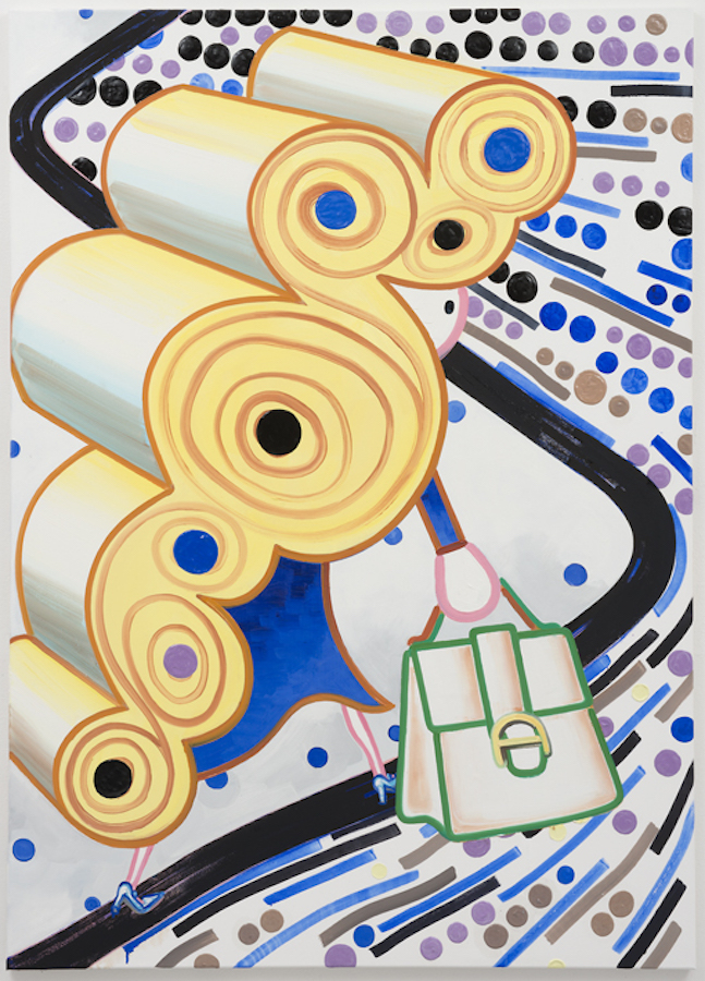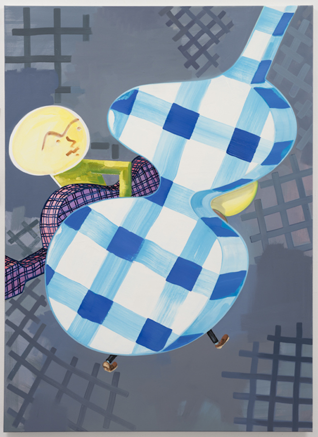 With Selin & Dilara (2013), Weber applies paint in bold, short strokes upon the two eponymous figures’ dresses, imparting a smeary, thick texture, while elsewhere he creates grids out of thin, loosely applied lines. Weber obviously relishes the irregularity of the hand and materiality of paint, as no grid is painted exactly the same. Selin and Dilara’s faces are rendered very simply, almost akin to emojis, a reflection as much of their ubiquitous usage today as to their predecessors in 19th century caricature and modernist art’s simplification of faces and the figure.