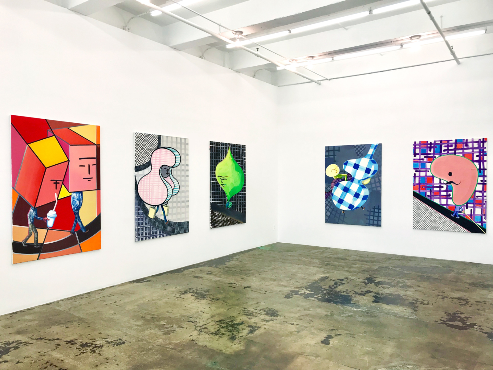 Projecting the city grid in all directions, Weber’s series explores a colorfully exploded, chimerical take on street observation, mining geometric abstraction, street life, comics, the microscopic, and the cosmic. The built world in C&A ripples with a rigorously off-kilter temperament, a mix of an observant eye, meticulous craft, and a deeply wry outlook. From the abstract painting movements of the 20th Century and Polke’s and Majerus’ strategic use of juxtaposition to 19th century French caricature (its popular renderings of large heads, small bodies, and biting social critique providing a particularly rich touchstone). Even Albert Einstein seems to hang over the series, his space-time model of the underlying fabric of the universe (often visualized as a cosmic web) adding still one more reference of order and scale—one even more grand and rational than the iconic city grid.