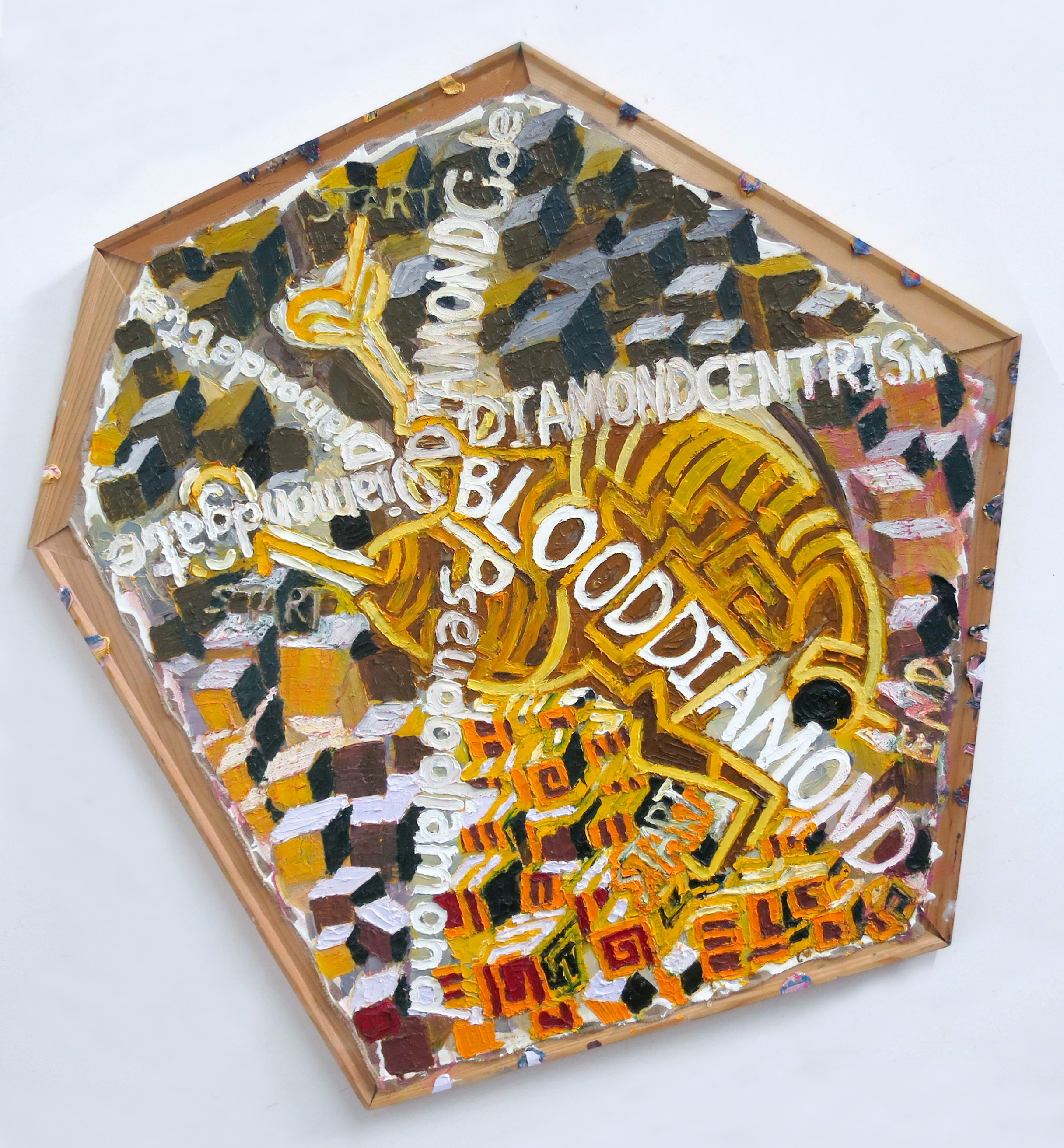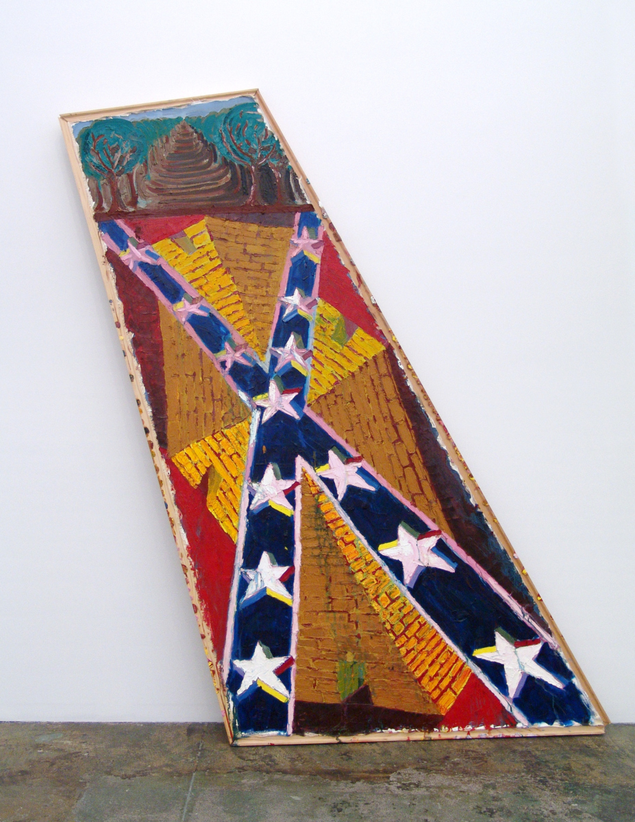 Working within his long-developed visual vocabulary, Cloud reexamines historical phenomena and appropriates emotionally loaded symbols. The artist picks apart his subject matter and puts it back together in new configurations – often using painted words as load- bearing elements – collaging his chosen components into an intuitive imprint; an extended process compressed into a single object. Each work becomes a vessel for a certain set of symbols, channeling one particular strain of history.