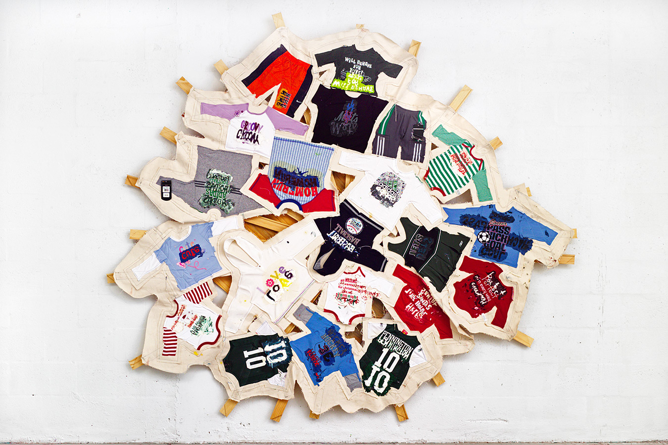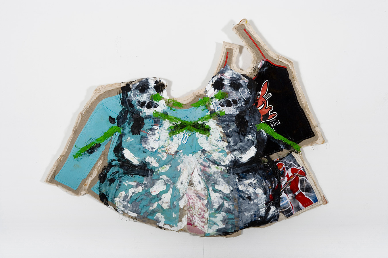 With their exposed stretchers splaying out beyond the edges and the stuffed canvas bulging outwards, the works pursue an embodied approach to abstraction, an interest that Cloud continues to explore. Rendering his images in a child’s messy, unencumbered hand, Cloud establishes a relationship between the clothing’s commercially oriented imagery and the expressiveness of a child’s actual imagination. While the clothing stirs a sense of childhood innocence, Cloud’s depersonalized mark making and relationship to the material (these are not his children’s clothing) thrusts the works into an objective, yet conflicted space of social relevance.