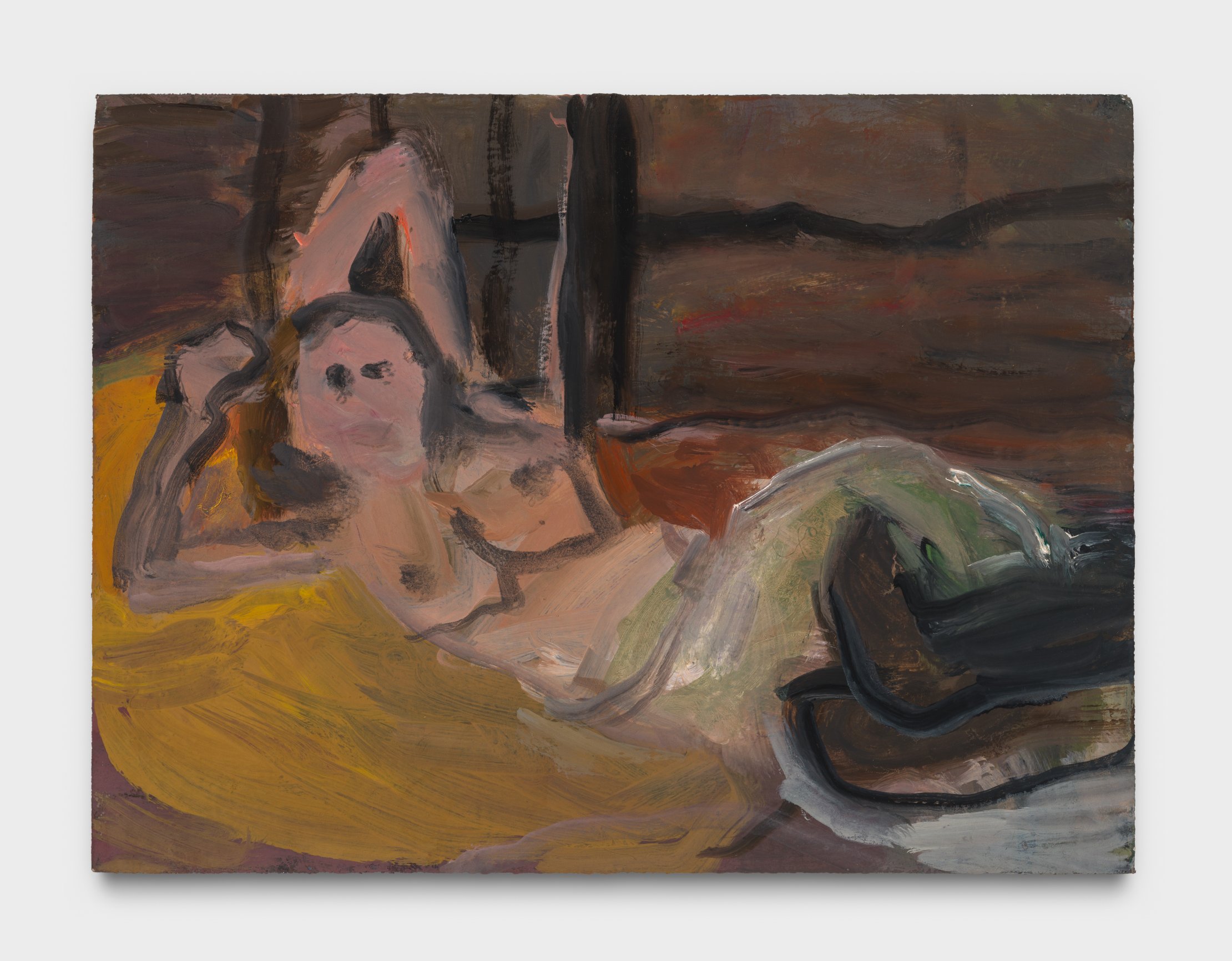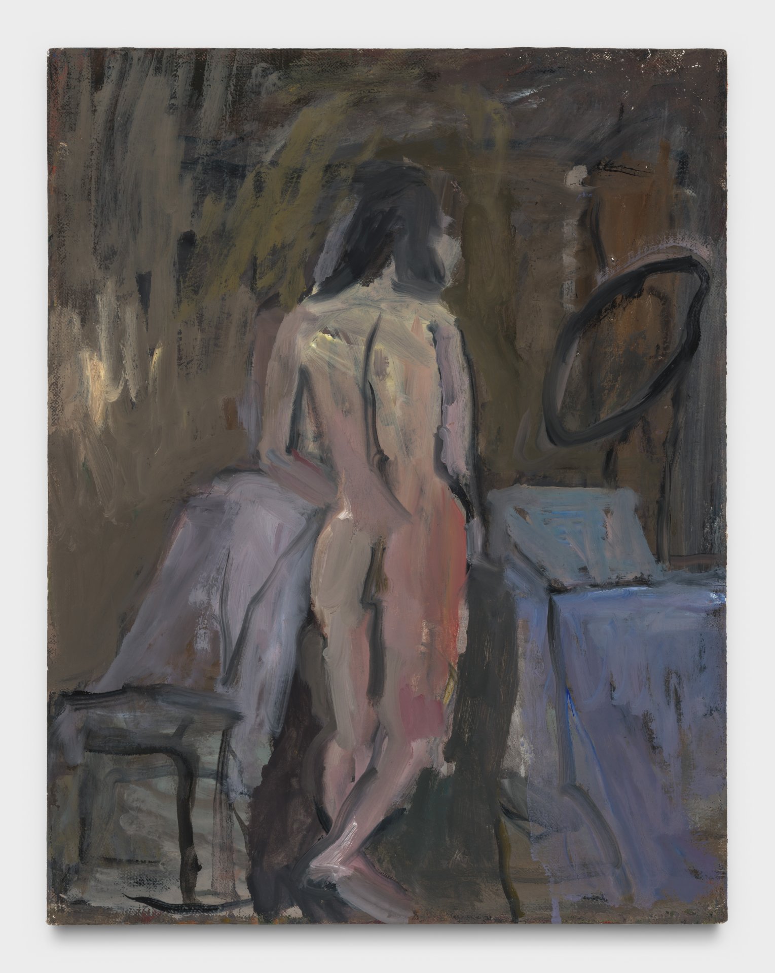 Nowinski’s most recent works reveal an increased engagement with color, such as the bright hues of yellow and orange in Nude in Front of Mirror, which complement her usual palette of richly varied earthy or fleshy midtones. There is also an increased spatial complexity in the hinted-at domestic spaces her nudes inhabit, and most importantly, an introduction of subtraction. Wiping off rather than continuously adding paint makes the works retain a more disintegrated, “unfinished” though simultaneously layered quality, furthering their contemporary appearance.