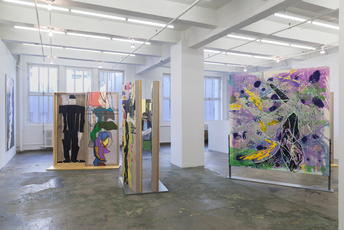Thomas Erben Gallery is pleased to announce models stand close to the paintings, an exhibition of new constructed paintings by Dona Nelson. Praised for her two-sided canvases that incorporate a wide range of techniques and materials, Nelson has established herself as an artist committed to thoroughly exploring the unfolding possibilities of her practice, wherever they may lead. The exhibition features a series of new freestanding works, in which Nelson has attached two paintings to a square base in parallel. These “boxes” are exhibited in front of a selection of works hanging on the walls, including older pieces from Nelson’s career that contextualize this culmination of her processes.