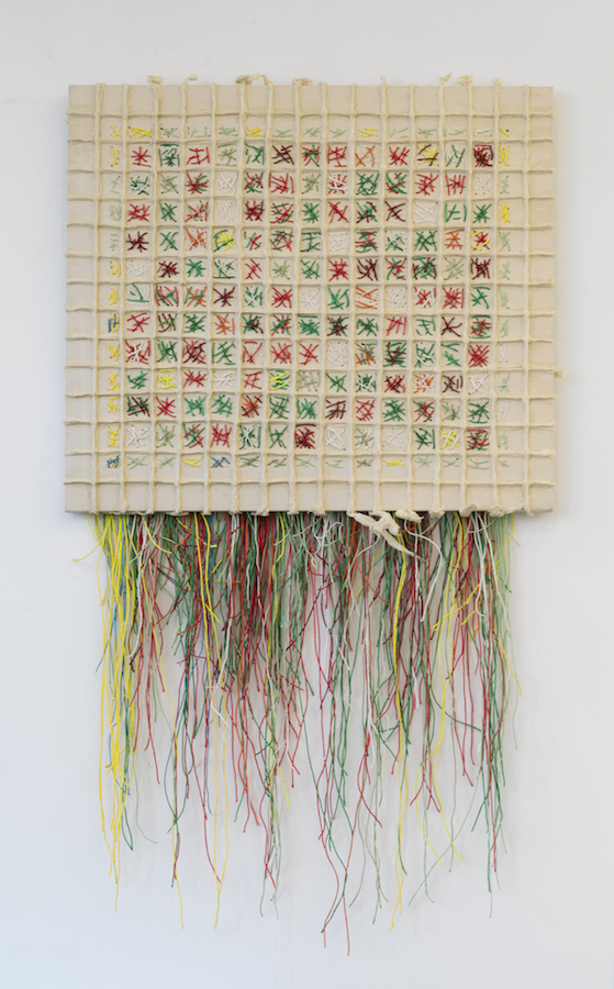 Hägar, 2017. Painted string and cheesecloth on canvas, 31 x 35 in. <i>Hägar</i>, 2017. Painted string and cheesecloth on canvas, 31 x 35 in.