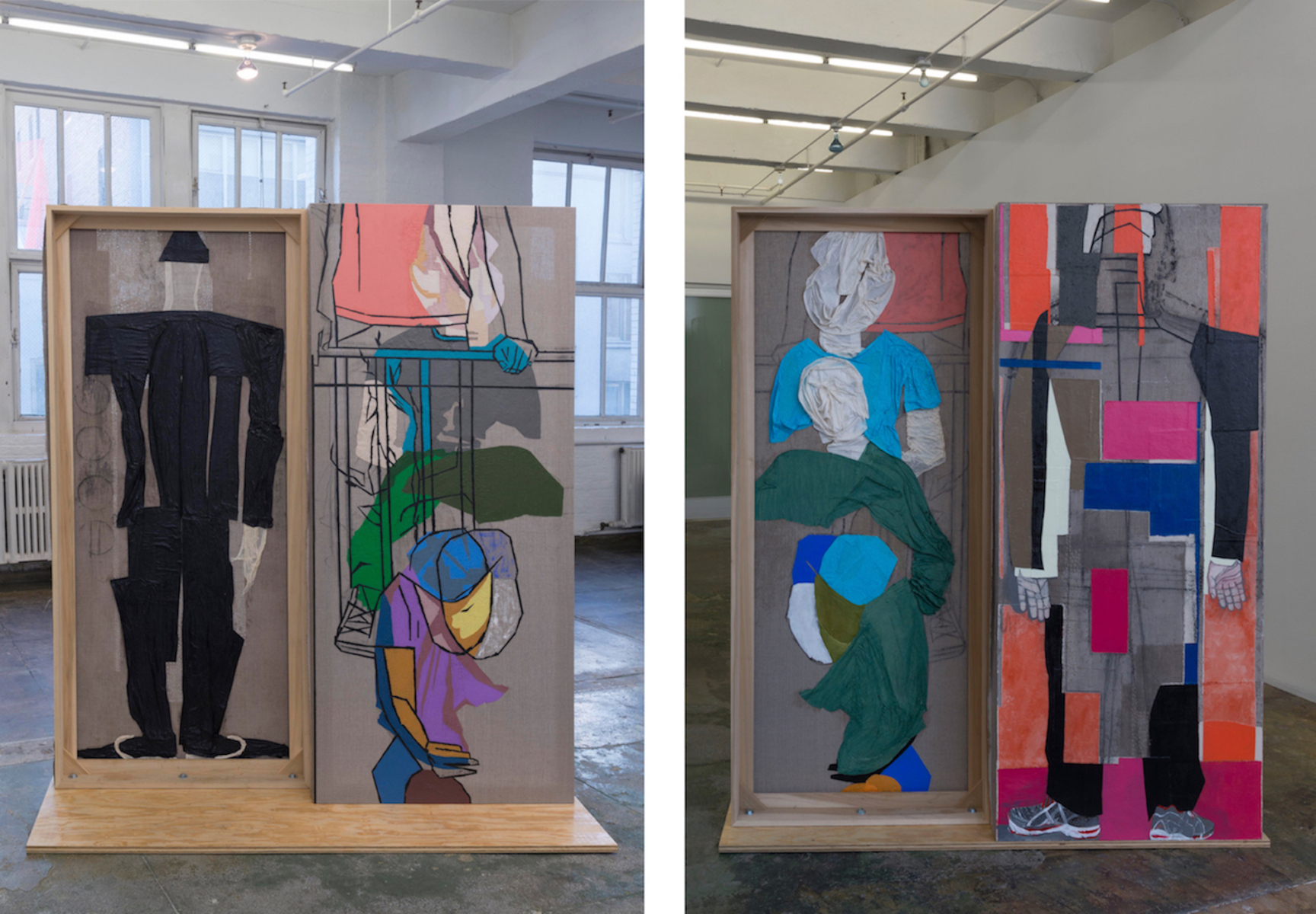 Passengers, 2016. Collage, dyed cheesecloth, muslin, and acrylic mediums on linen panel mounted on plywood base, panel: 81.5 x 36 in, base: 38 x 32 in. <i>Passengers</i>, 2016. Collage, dyed cheesecloth, muslin, and acrylic mediums on linen panel mounted on plywood base, panel: 81.5 x 36 in, base: 38 x 32 in.