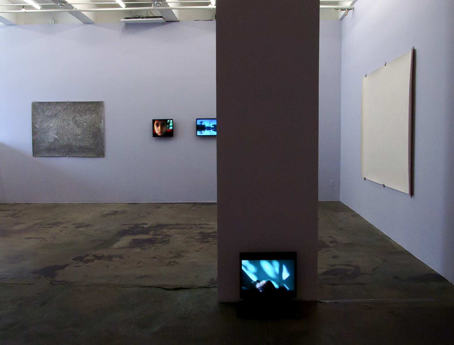 Khawaja’s videos are equally sensitive, transmuting external forces and sounds into “mark-making.” In Light Sleep, street and car noises punctuate and draw upon the rhythm of breathing and gentle tree-filtered light on the artist’s face. Similarly, Flesh It Out employs the mounting vibrations and sound of an auto rickshaw to hauntingly blur Khajawa’s steady stare at the camera. Unlike the drawings, in which Khawaja seems to exist wholly in her own body, the videos show her engaging with elemental forces.