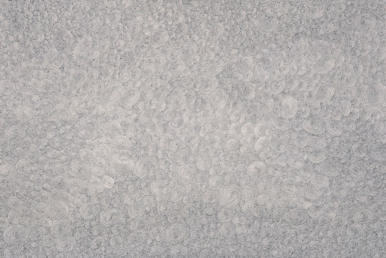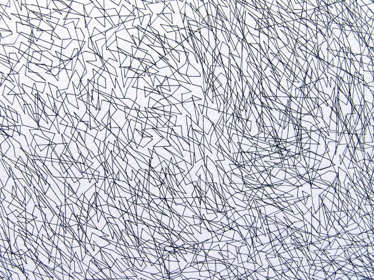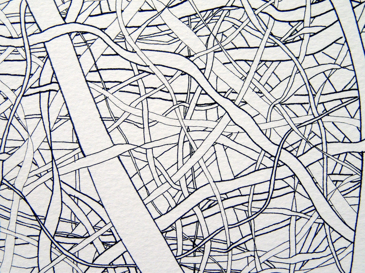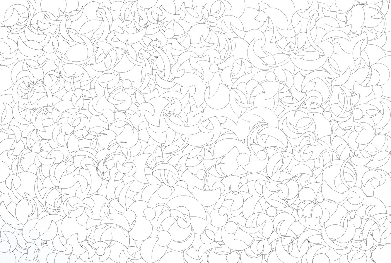 Khawaja executes her black felt-tip pen drawings on often large-scale (up to 8’ x 5’) sheets of paper. Part daily routine, part meditation, her work appears to sublimate interior as well as exterior conditions, growing increments of small details into sometimes full-blown fields, sometimes unifying structures. Drawn by hand with a high degree of precision, her lines take on angular, organic or loopy vectors, shaping into swirls, grids or geometry. It is important for Khawaja to enter into a certain rhythm, leaving behind rationality, and to create a space rather than an image, a vision more than an idea, a human capacity rather than a human story.