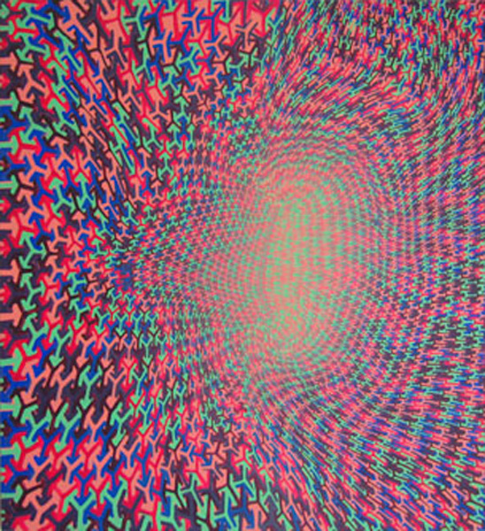 The densely patterned, abstract paintings of Anoka Faruqee (b. 1972, Ann Arbor, MI) are composed of tripods and asterisks. Her chromatically gradated, hand painted surfaces recall warped pixelated spaces, Islamic tile geometry, and abstract color-fields. Adhering to a diligently methodical process, Faruqee has supplanted spontaneity and dramatic gesture through controlled repetition, thus finding self-expression within the potential of geometric space.