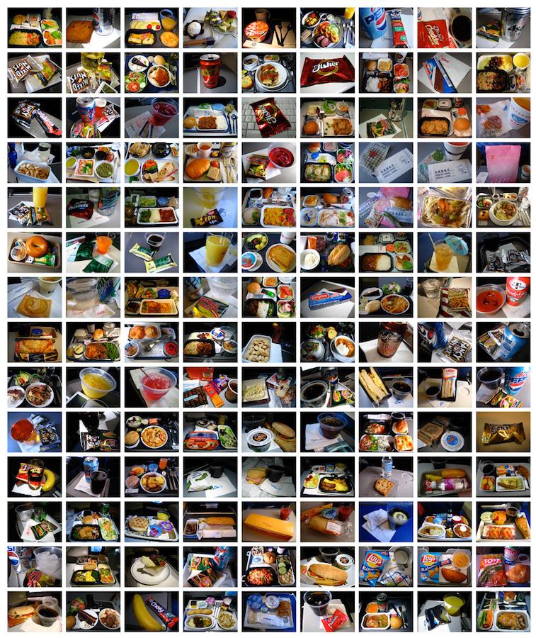 Hasan Elahi (b. 1972, Bangladesh) is perhaps best known for his ongoing FBI tracking project. Ten years ago, Elahi was detained by the FBI for suspicion of housing explosives in a Florida storage unit. After an exhaustive investigation, the agents were convinced of their error. To avoid future “complications,” Elahi has since documented every detail of his life by providing a real time map with financial data, communication records and transportation logs. In our exhibition, a photograph of airplane meals demonstrates his interest in the public and investigative value of an overwhelming amount of personal information.