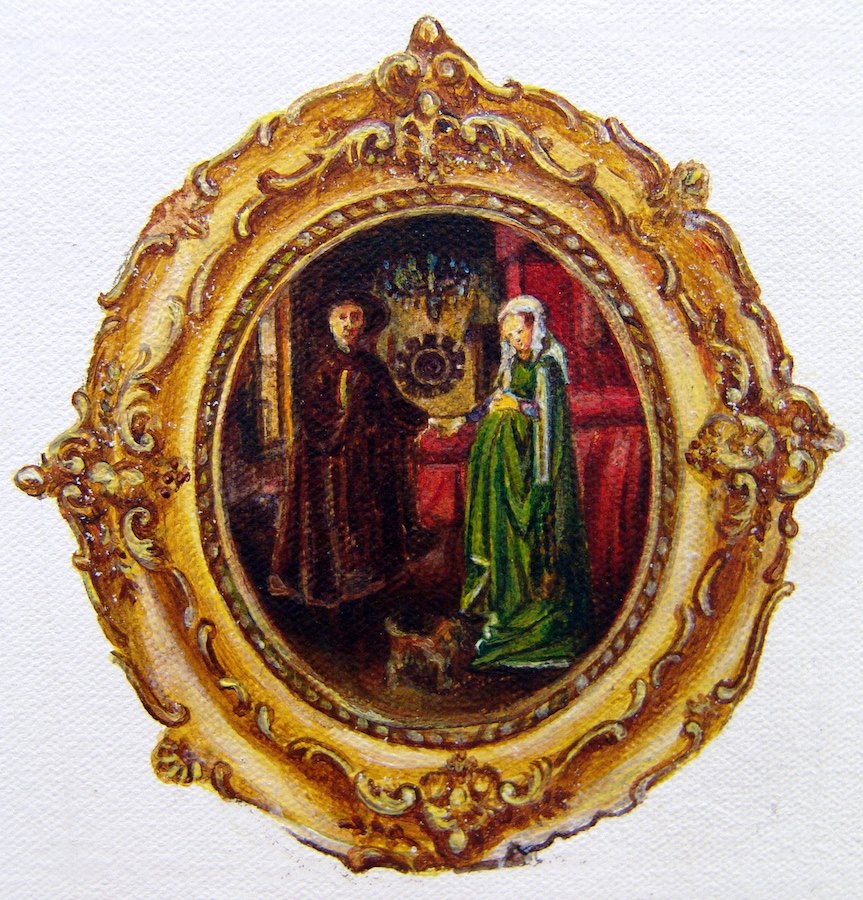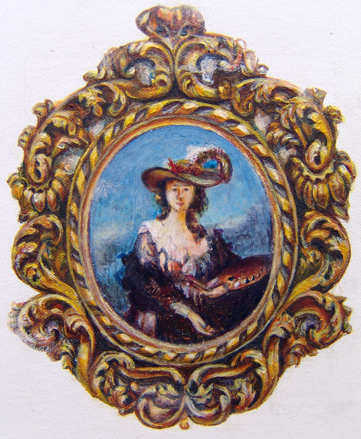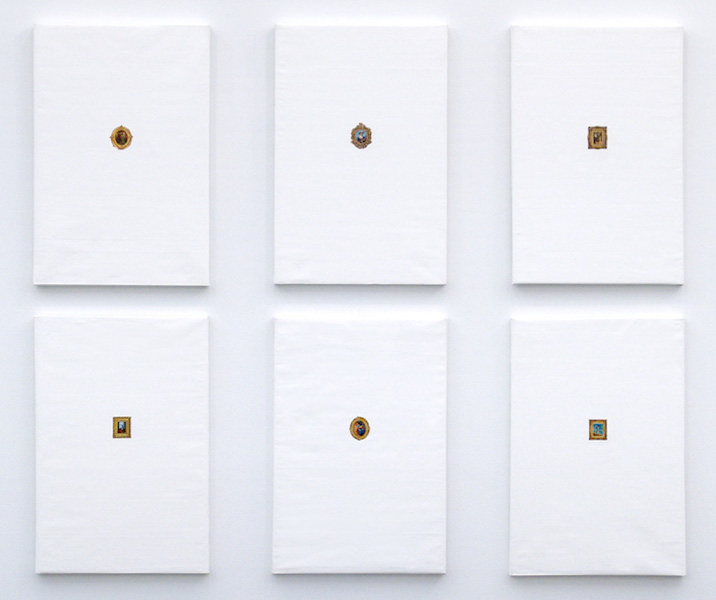 Koshal Hamal’s (b. 1988, Mugu, Nepal) works are engaged in a synthesis of appropriation, combining Western art with the historical format of miniature painting. Working in oil, he copies Western art historical works (and their gilded frames), in diminutive size, onto larger scale primed canvases. He grants these works the specialness of singularity, while simultaneously reevaluating and taking ownership – conceptually as well as culturally – through the act of appropriation and miniaturization.