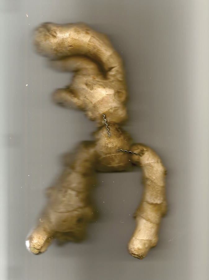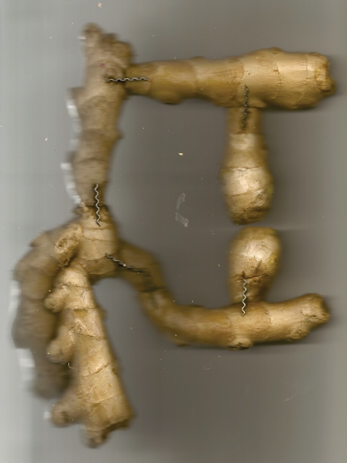 The primary concern of interdisciplinary artist Sreshta Rit Premnath (b. 1979, Bangalore, India) is how “political and economic power produces [an] unequal distribution of knowledge” and “how paradigms of power produce and constitute our relationship to objects and events in the world.” Rhizome – a photo series of manipulated roots, linked together with crimped metal inserts – focuses on the ginger rhizome, a household cooking ingredient with locally well know medicinal uses in India and China, whose genes have been patented by pharmaceutical corporations for commercial use. The ways in which systems of knowledge have been, and continue to be colonized is an underlying theme.