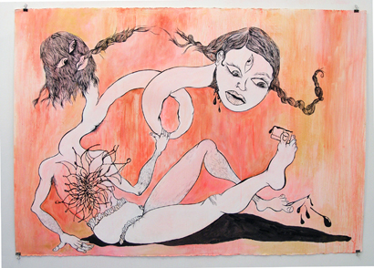 Thomas Erben is excited to present three artists whose work employs signifiers of Indian culture and mythology, both historic as well as popular, to challenge traditionally prescribed notions of femininity, sexuality, and form. The media used are hybridized (mainly video, drawing, and collage) as are the cultural influences: