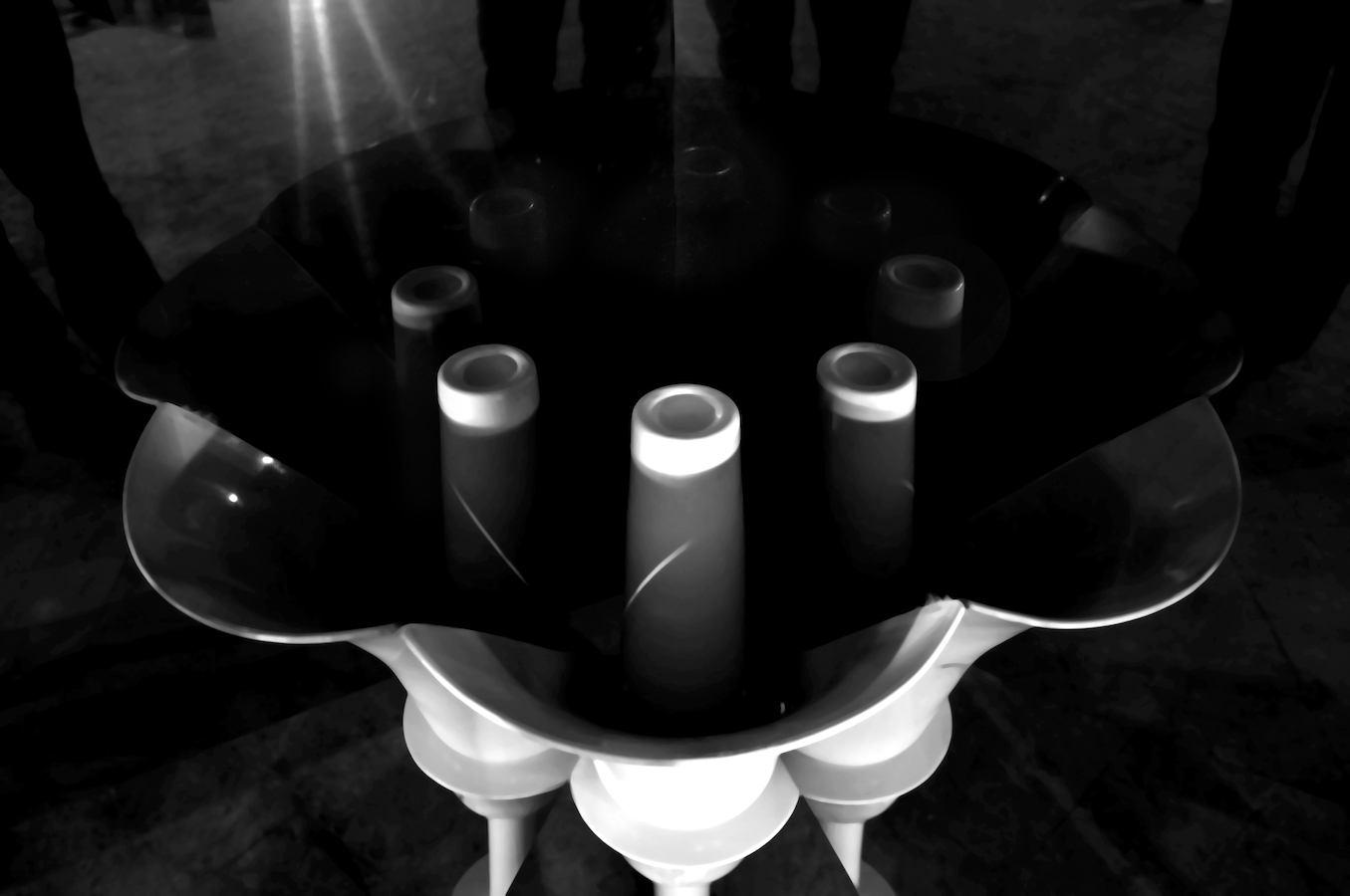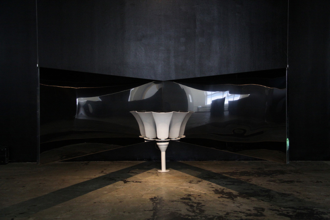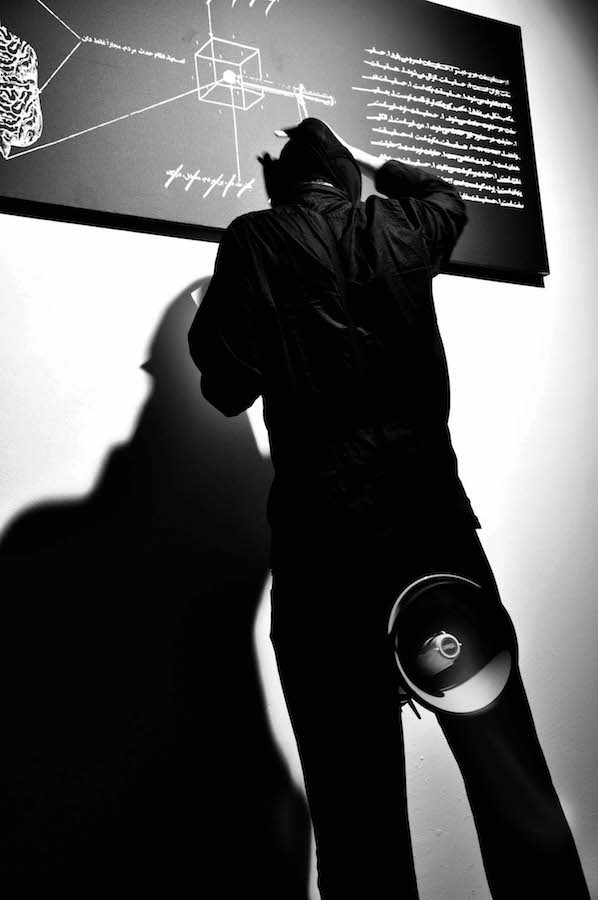 A megaphone built into the short end of a protruding v-shaped mirror appears as a multi-pedaled flower in Narcissus Echoes (2009-10), see image above. When drawing close, one witnesses a remorseful confessor – the artist – who has gone through numerous répétitions only to become another descendent, a new echolalic agent of the ideology of the “Sacred System”. He speaks within a cluster of “truths”, revealed to him under mental and physical abuse in prison. In solitude – where no “alien” thoughts could penetrate – the artist confesses his socio-political, sexual and cultural sins. An ambivalent symbol of authority and spectacular atonement in Narcissus Echoes, the megaphone is liberated in the documented “Aktion” Distribution of the Sacred System (2010) and becomes the mouthpiece of dissent.