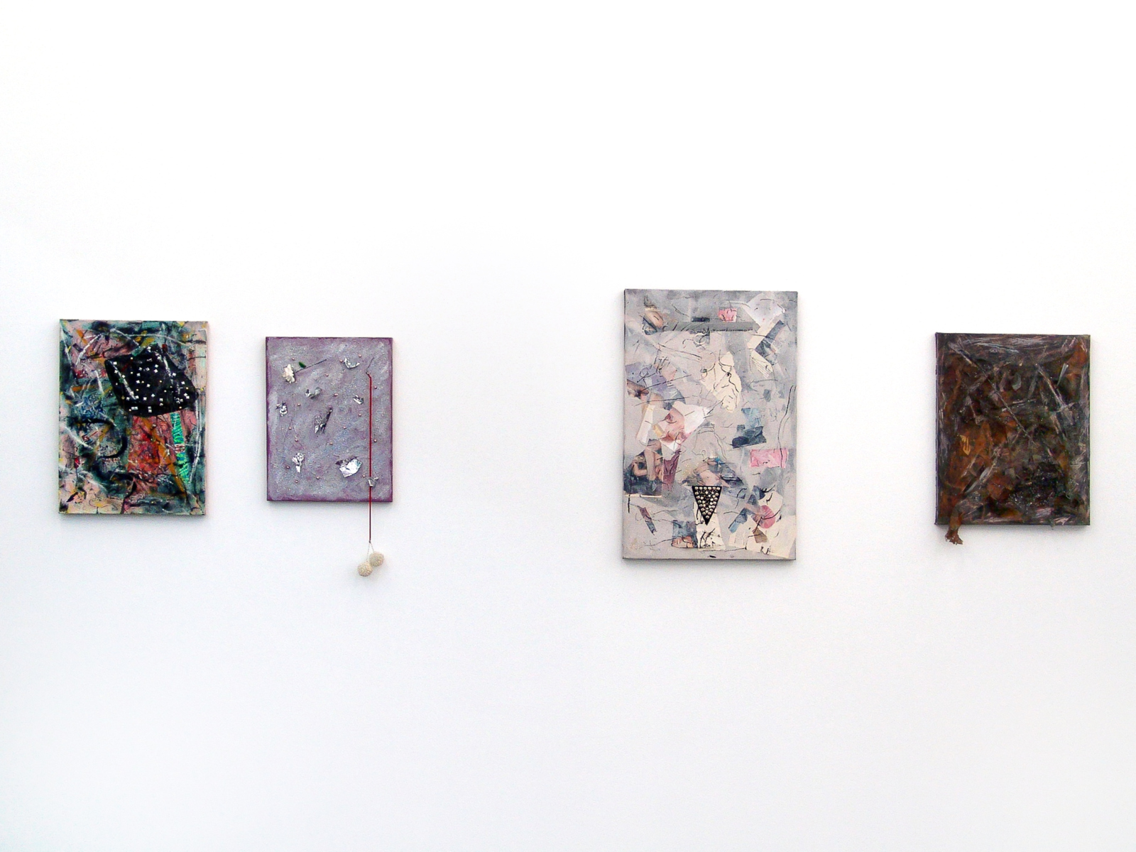 Hans-Peter Thomas (Bara) (b. 1968, Bonn, Germany) demonstrates an interest in grids and shelving as comparative devices, as if systematically displaying a personal set of symbols and objects for the viewer to inspect. This selection of paintings is comprised of sprawling, superimposed grids populated by rectangles of bright color, teeth and head shapes, as well as actual physical objects such as rubber masks and perfume bottles. The color and images create a crowded cacophony of items to interpret and synthesize into workable information. Arrows hint at relationships between the objects depicted, but rather than being helpful and clarifying, they add further to the confusion. And as much as items are sorted into neat boxes, there is a competing impulse striving toward disorder, tilting and overturning stable structures and tipping the paintings into a state of perilous balance.