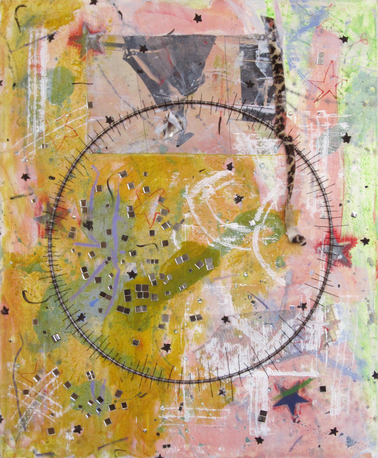Whitney Claflin, Untitled, 2011. Oil, magazine, safety pin, newspaper, fabric, mirror studs, ceramic, wire and thread on canvas, 23 x 19 in. Whitney Claflin, <i>Untitled</i>, 2011. Oil, magazine, safety pin, newspaper, fabric, mirror