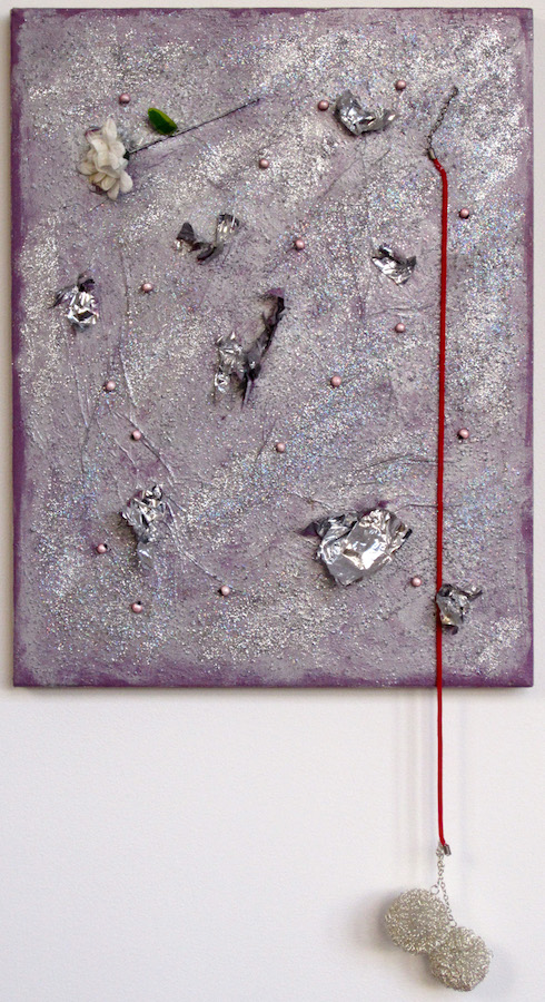 Whitney Claflin, Untitled, 2011. Oil, glitter, beads, Mylar, faux flower, necklace and earrings on canvas, 17 x 13 in (canvas size). Whitney Claflin, <i>Untitled</i>, 2011. Oil, glitter, beads,