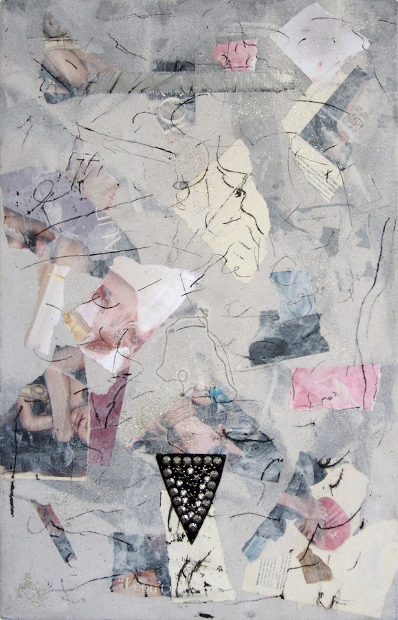 Whitney Claflin, Untitled, 2011. Oil, magazine, duct tape, necklace studded appliqué and glitter on canvas drop cloth, 28 x 18 in. Whitney Claflin, <i>Untitled</i>, 2011. Oil, magazine, duct tape, necklace