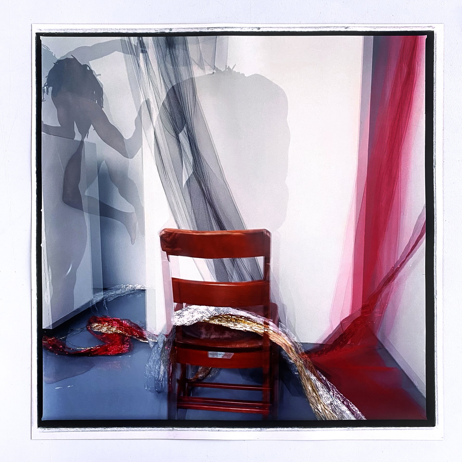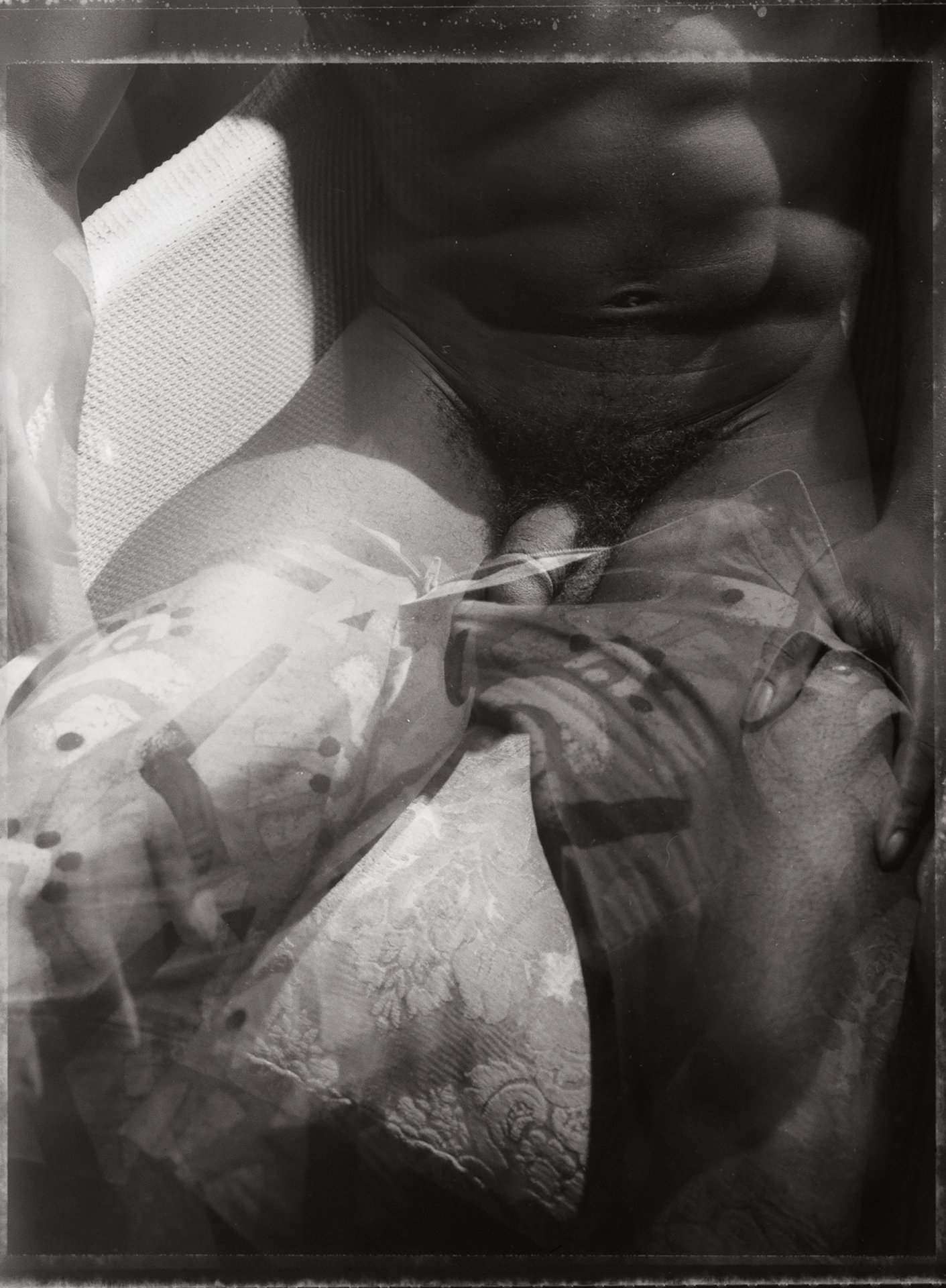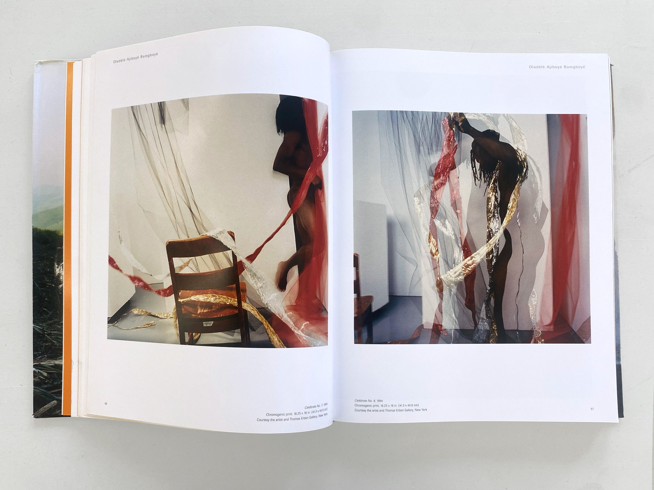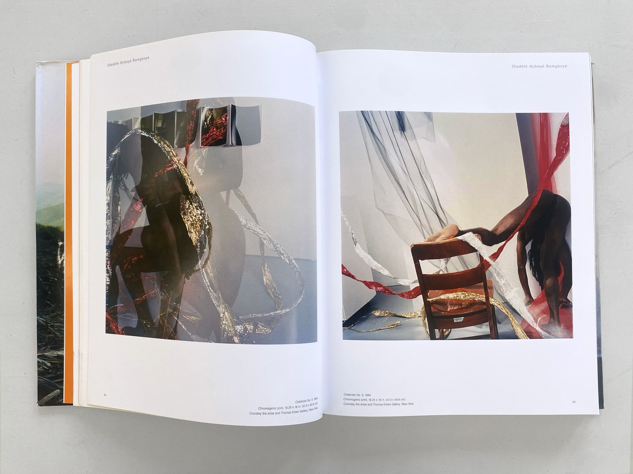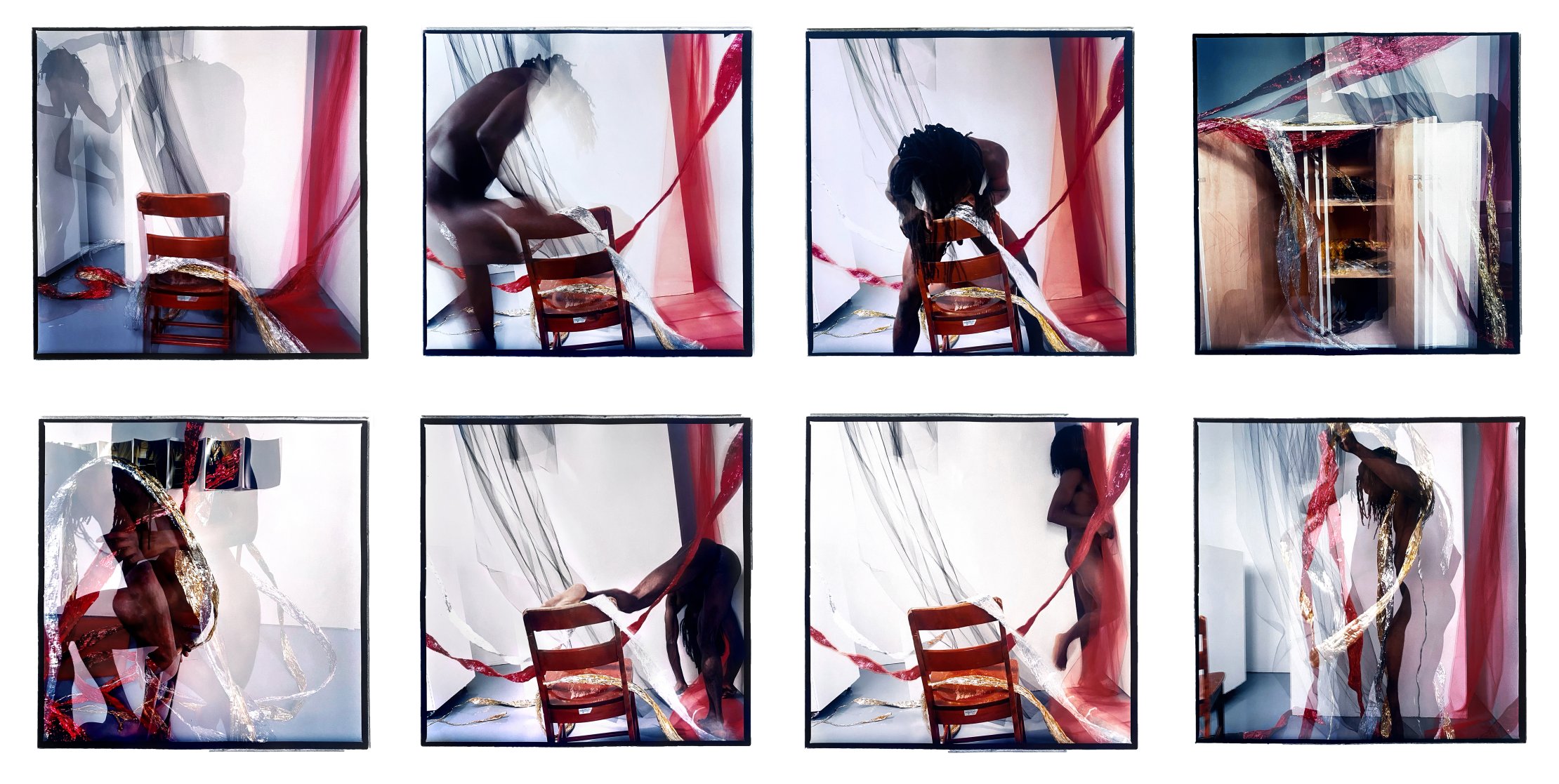 Similarly in Celebrate (1994), Bamgboyé choreographs his body in a series of eight, multiple exposed color photo- graphs. Extending his movements using flowing bands of red, white and golden fabric, the artist creates fluid images of sensuality, joy and celebration, liquifying static ideas pertaining to social hierarchies, masculinity and blackness.