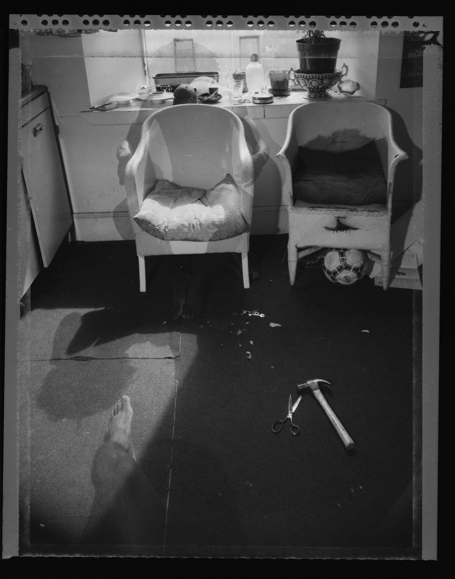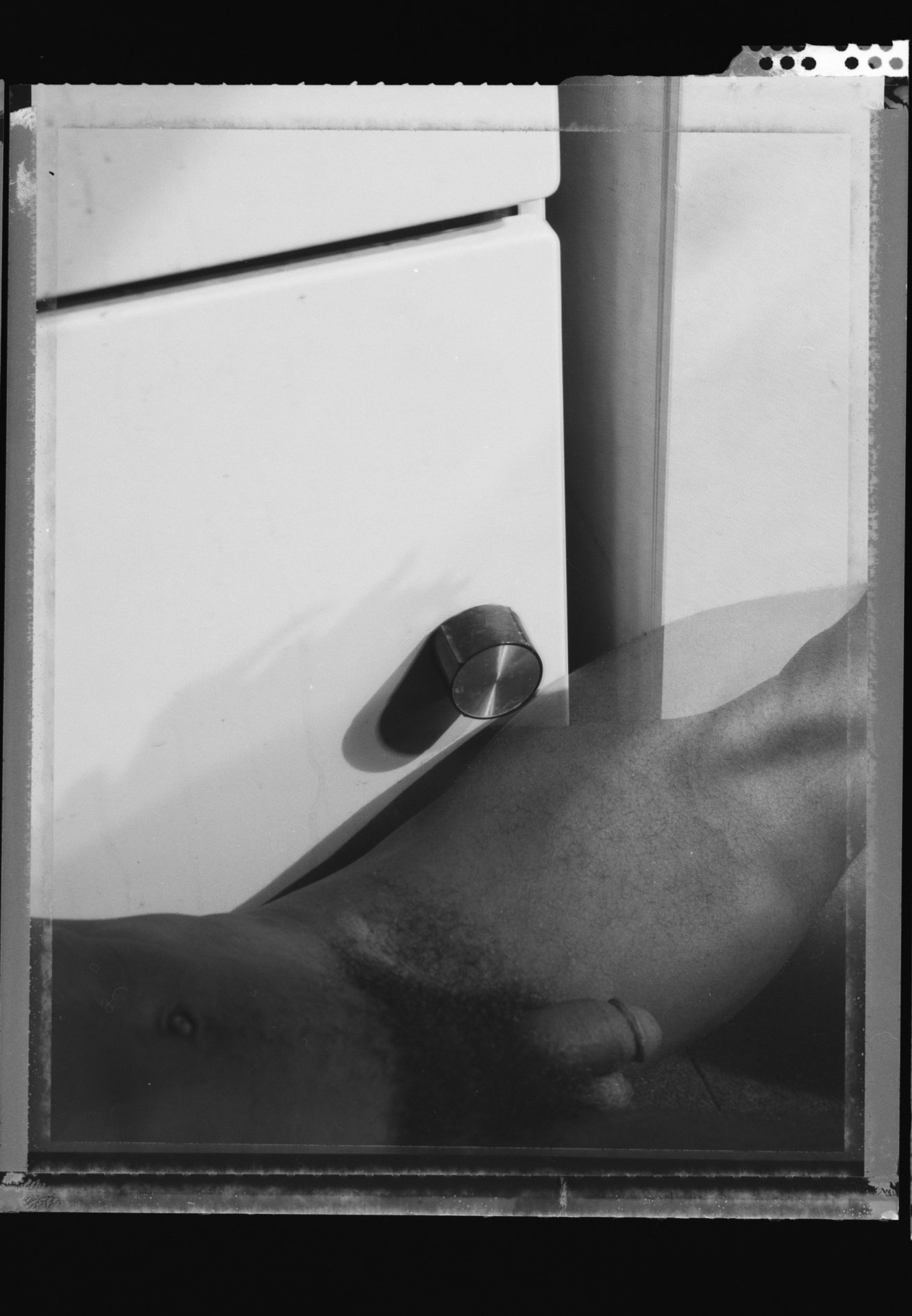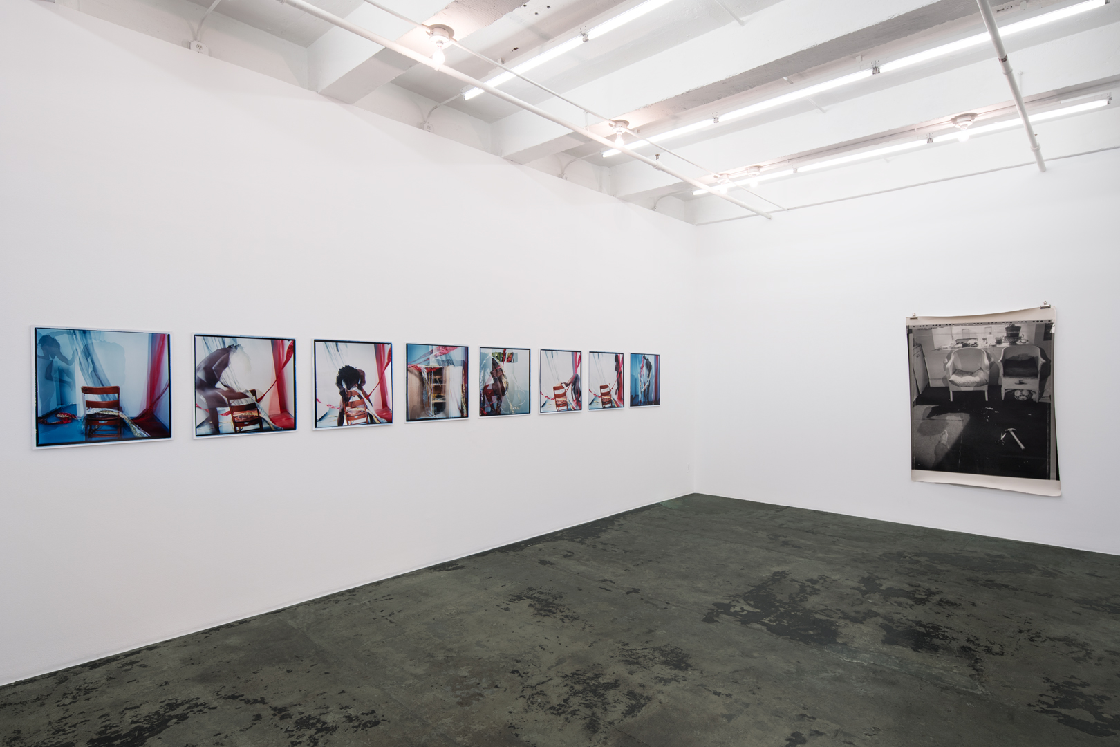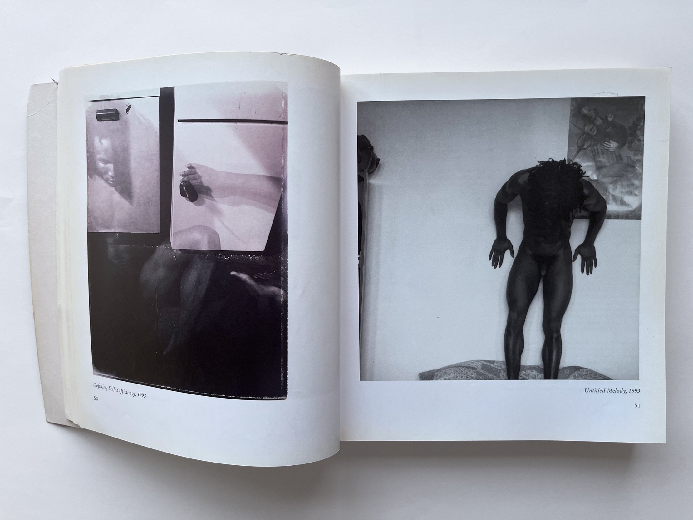 The exhibition is organized around three distinct yet interrelated bodies of work. A group of seven, large scale, silver gelatin photographs collectively titled Defining Self Sufficiency (1993) portrays the artist in his Glasgow kitchen. Unprecedented within the history of African self-portraiture, Bamgboyé comfortably photographs himself in the nude, multiple times present in his images with the use of overlayed exposures. Surrounded by his quotidian domesticity, the artist exudes a level of ease and content, countering our usual projections onto the “black male body”, while his manifold presence points towards a multiplicity of selves.