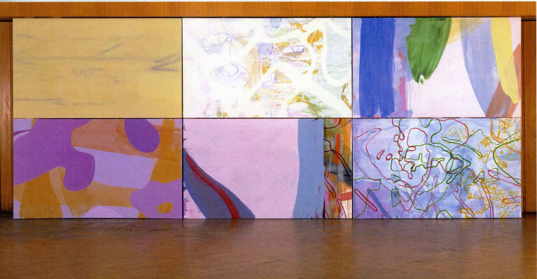 The utilization of oils, acrylics, or silver paint allow Lanz to create such varied effects as accumulations of translucent washes, vibrant depths of color, and occasional muting silvery expanses. His application of a broad formal vocabulary is rhythmically sure and generously precise.
