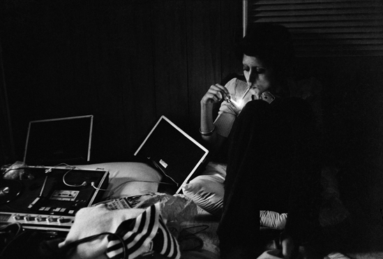 The images in Outside In are immediately recognizable as part of a certain documentary tradition – Larry Clark and Nan Goldin come to mind – where a marginalized group is seen, candidly and uncompromisingly, through the eye of an insider. Scenes with people dancing, resting, posing, or just hanging out smoking pot, mix with atmospherically empty vistas, all in starkly contrasted black and white. Turbulence mingles with lethargy, grime with transcendent light. The immediacy of the situations depicted is reflected in the raw and grainy materiality of the prints themselves, with the photographer pushing his medium towards its limits.